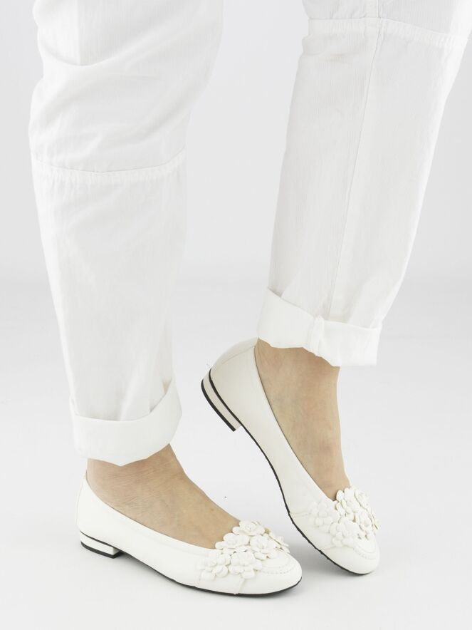 Een ballerina van Kennel & Schmenger in de kleur roomwit. Over de voorvoet loopt een brede band met decoratieve bloemetjes. De rand van de hak is bekleed met roomwit leer. De zwarte zool is aan de onderzijde licht geribbeld.