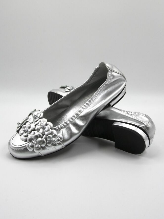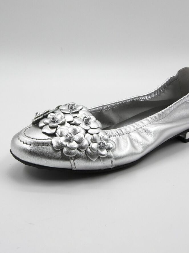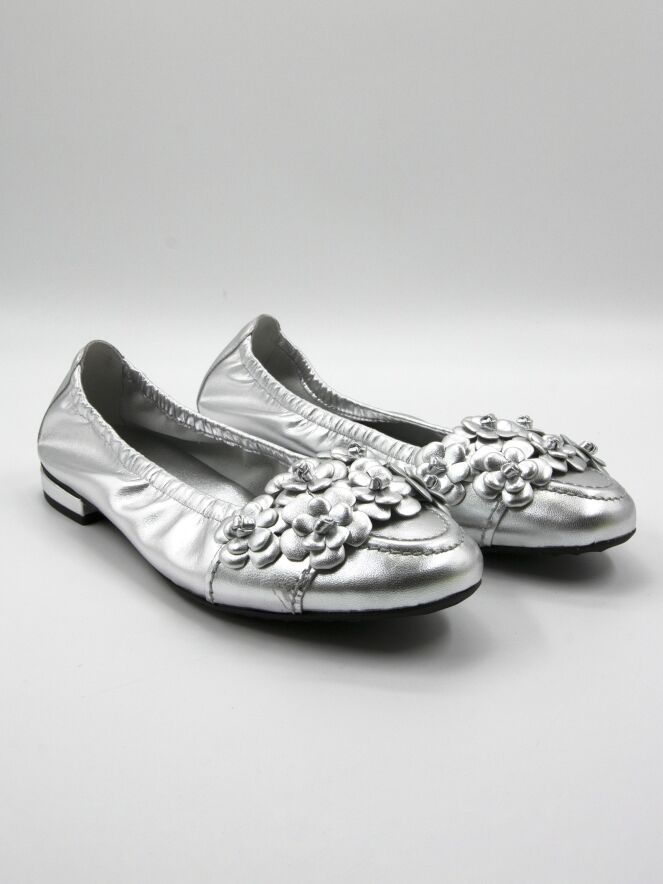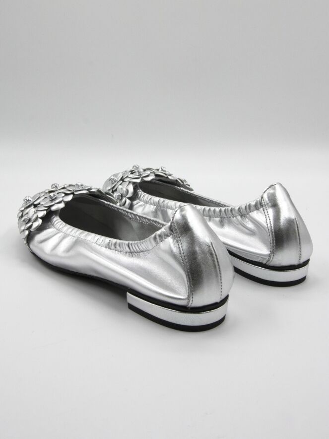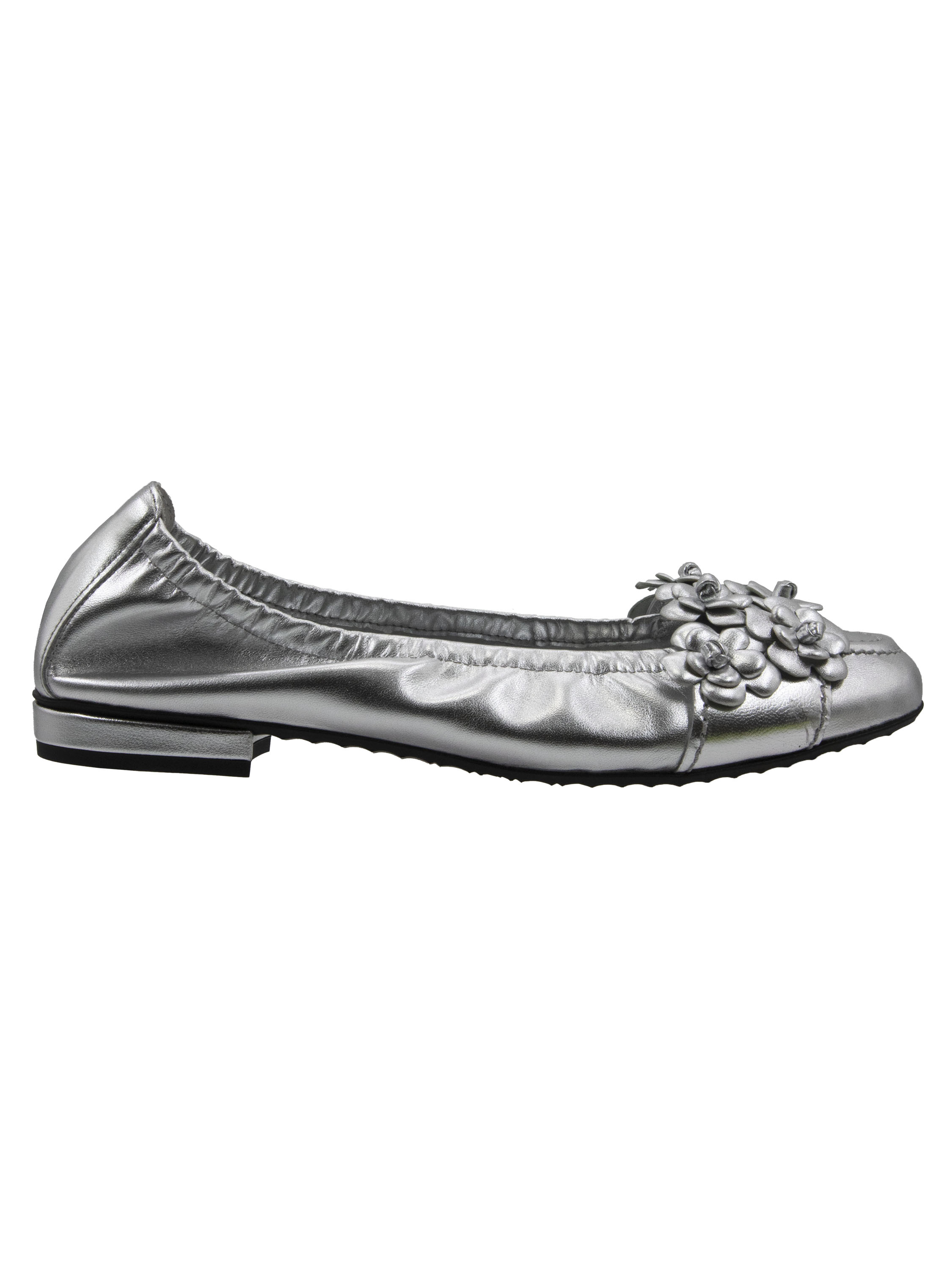 Een ballerina van Kennel & Schmenger in de kleur zilver. Over de voorvoet loopt een brede band met decoratieve bloemetjes. De rand van de hak is bekleed met zilverkleurig leer. De zwarte zool is aan de onderkant licht geribbeld.