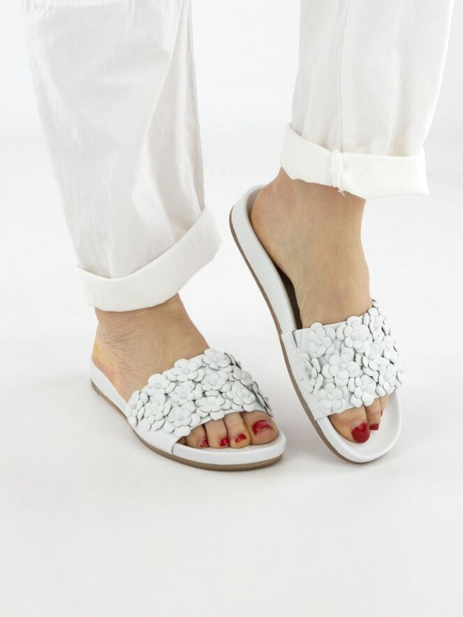 Slipper van Kennel & Schmenger in een elegante roomwitte tint. Over de voorvoet loopt een brede band, verfijnd afgewerkt met decoratieve bloemetjes die zorgen voor een vrouwelijke en zomerse uitstraling.