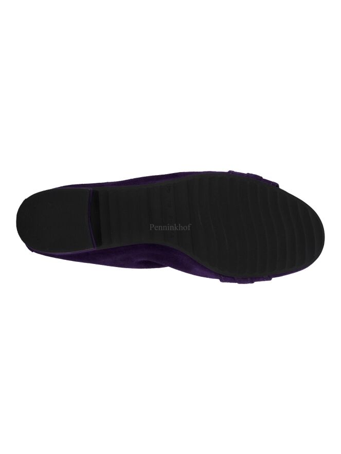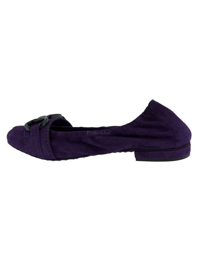 Een ballerina van Kennel & Schmenger in de kleur paars. Op de voorvoet is een mat zwarte gesp met een decoratief hartje in het suède. In de rand van de schacht is elastiek verwerkt.