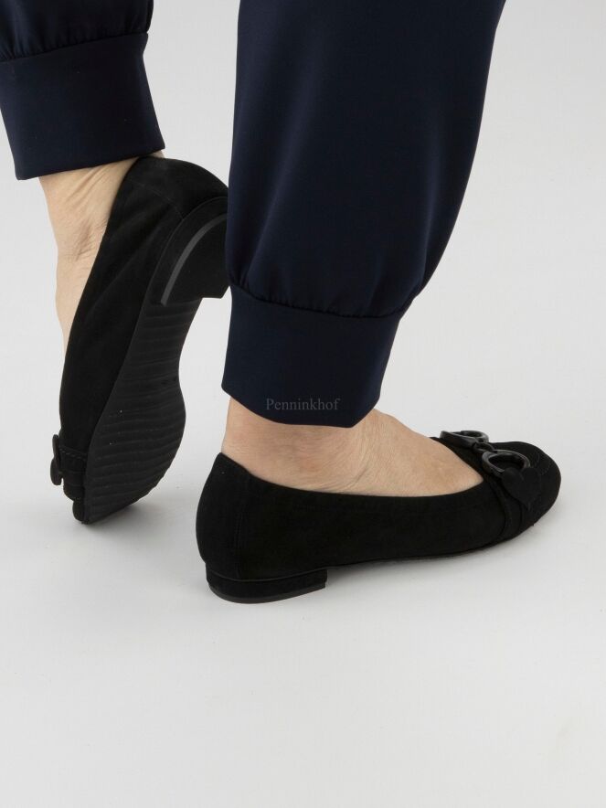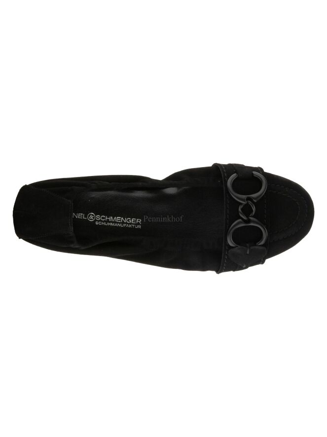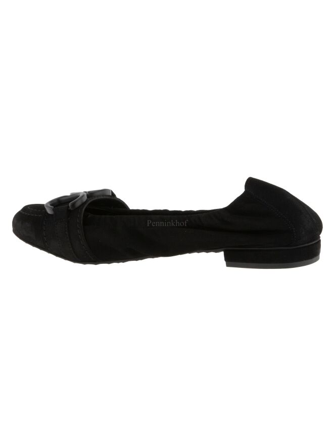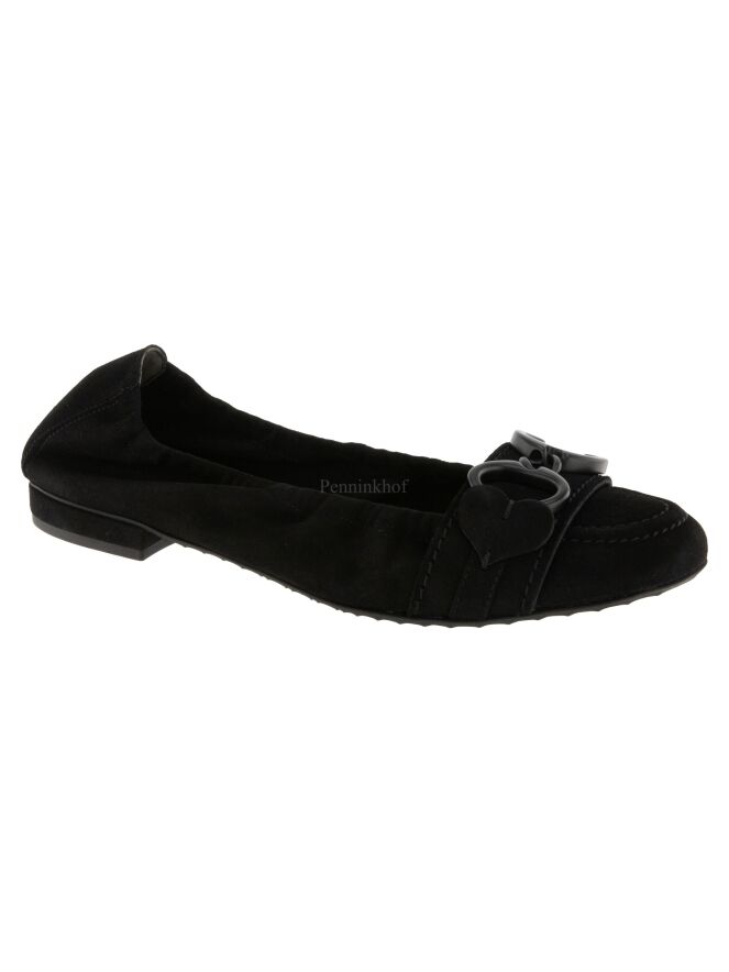 Een ballerina van Kennel & Schmenger in de kleur zwart. Op de voorvoet is een mat zwarte gesp met een decoratief hartje in het suède. In de rand van de schacht is elastiek verwerkt.