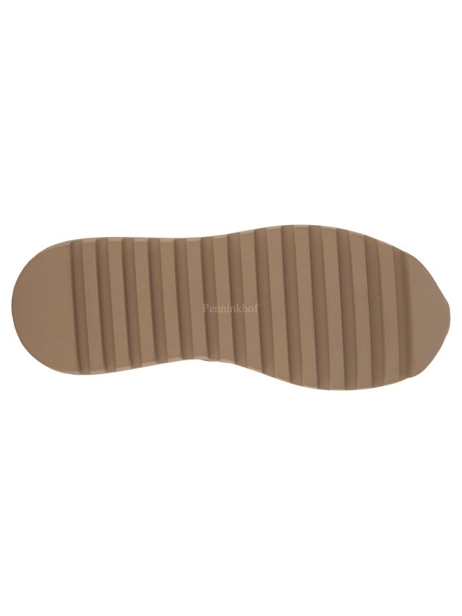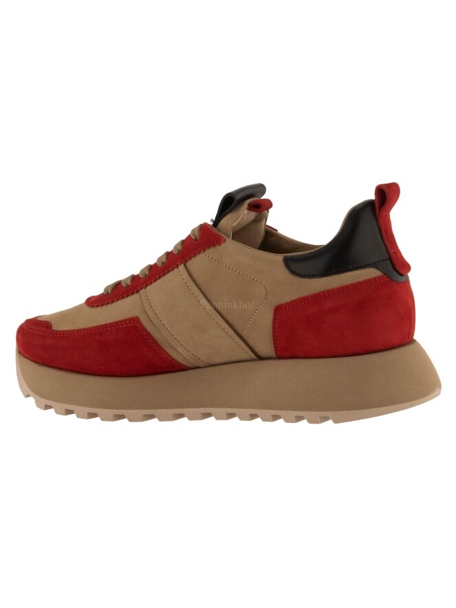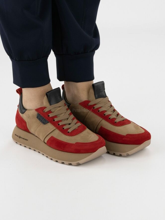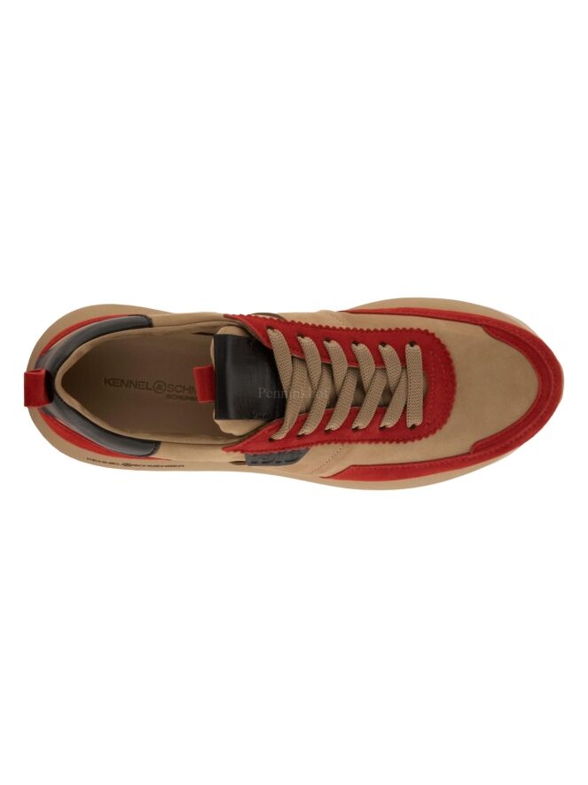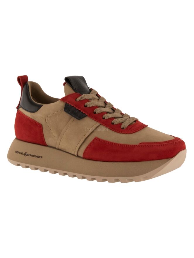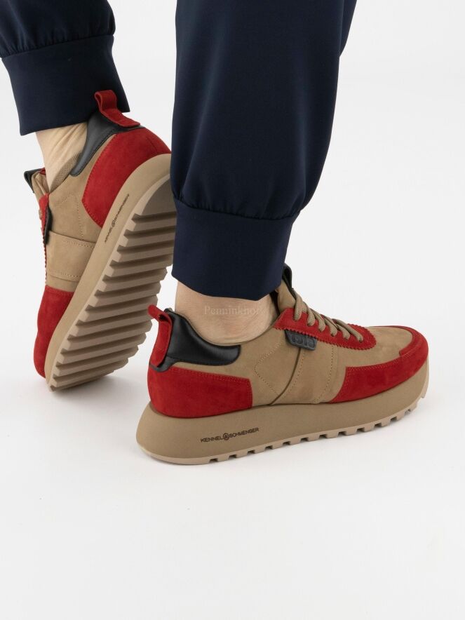 Een sneaker van Kennel & Schmenger in rood met camel kleurig camoscio suède. OP de tong en de hiel van de sneaker is een stuk zwart leder. De sneaker heeft een gekartelde camel kleurige plateauzool.