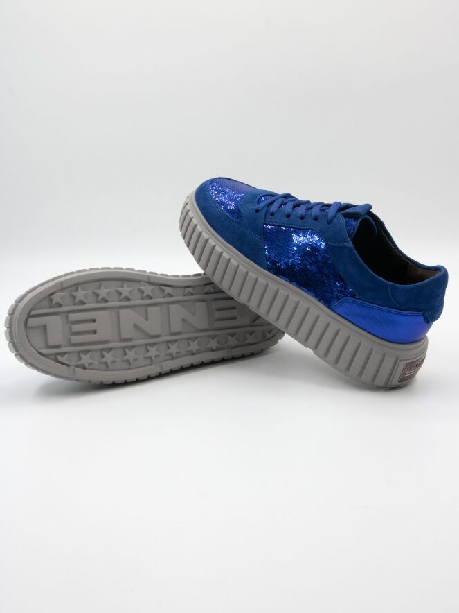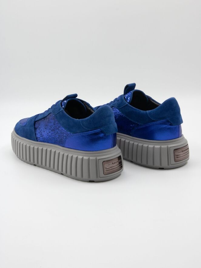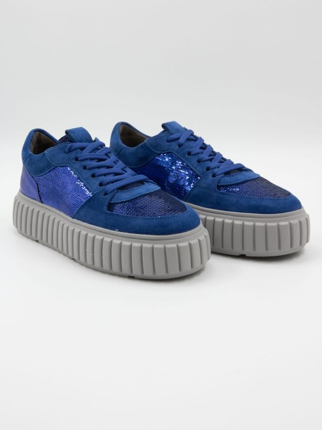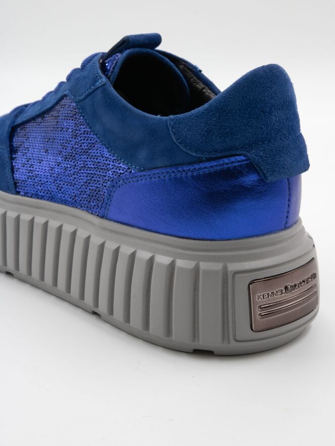 Een sneaker van Kennel & Schmenger in de kleur kobalt. Op de voorvoet en langs de zijkanten is de sneaker bekleed met zilver kleurige lovertjes. De grijze plateauzool is gekarteld.
