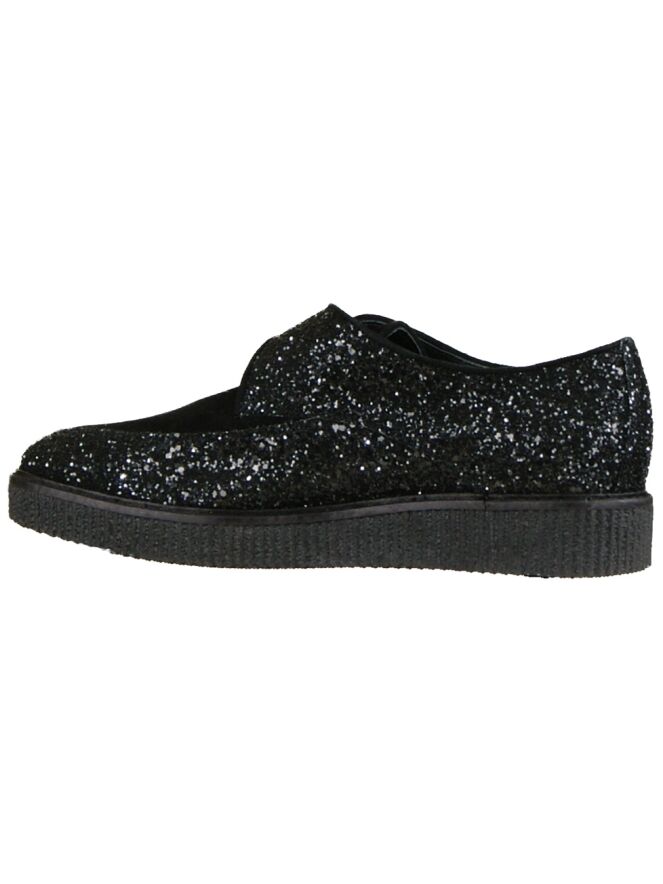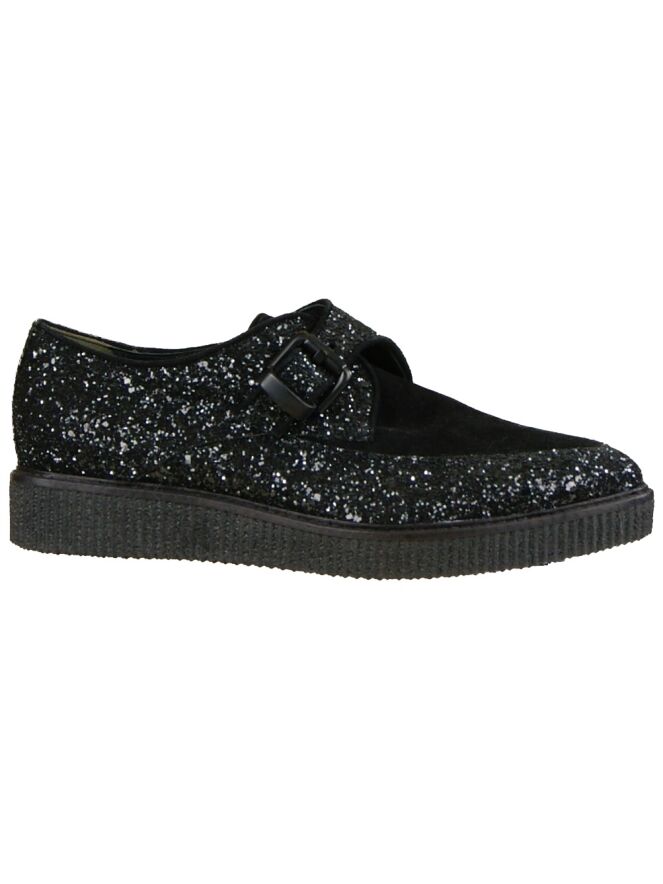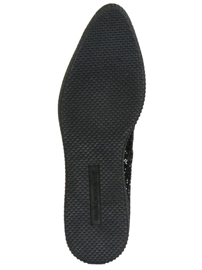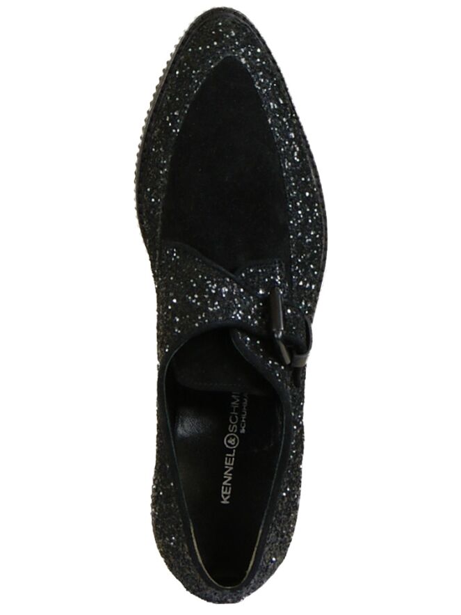 Een instapper van het merk K&S of Kennel und Schmenger in de kleur zwart. De instapper heeft een spitse neus en Is grotendeels bekleed met stras steentjes. Over de voorvoet loopt een gesp in de kleur zwart. De zijkant van de zool is geribbeld.