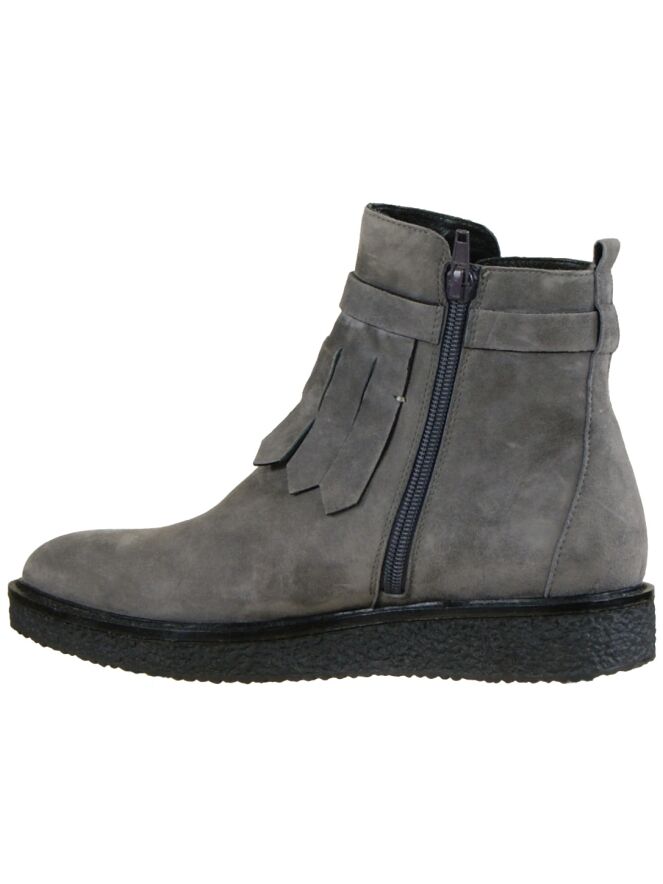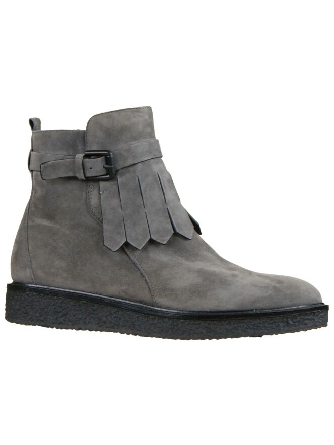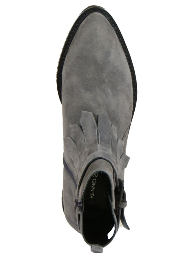 Een kort laarsje van het merk K&S of Kennel und Schmenger in de kleur grijs. De neus van het korte laarsje is spits en voor op de schacht is een tong met een riem hier over heen. De riem heeft een gesp in de kleur antraciet. Het laarsje heeft een sportieve ruw zool en is aan de binnenzijde met leder gevoerd. Aan de binnenzijde van het laarsje is een rits verwerkt