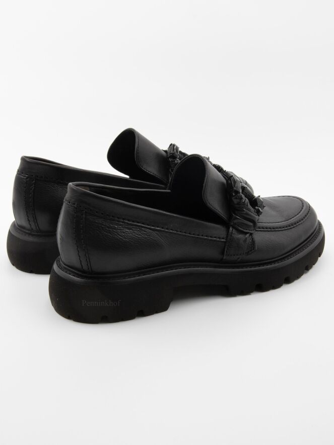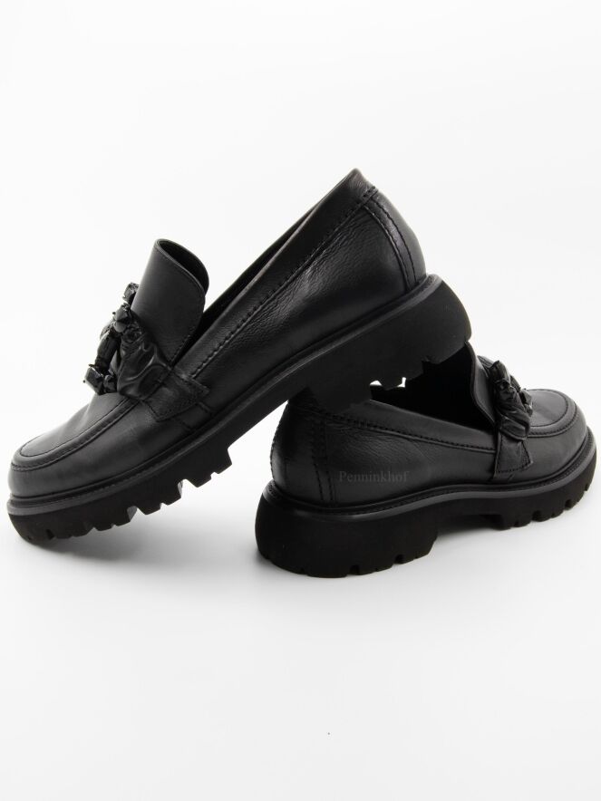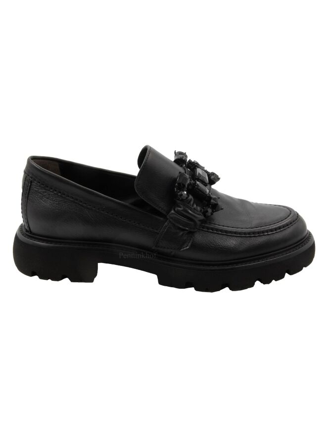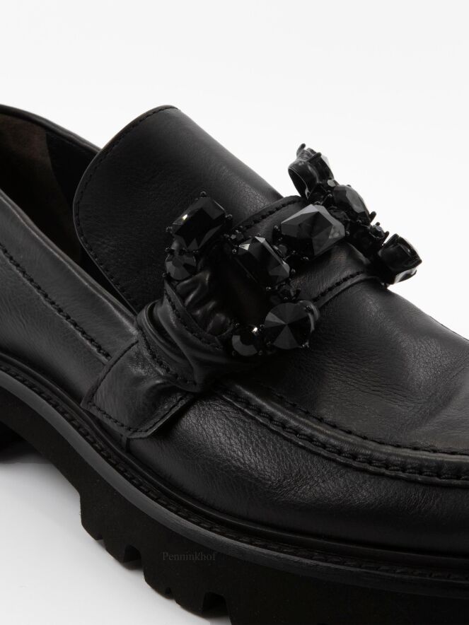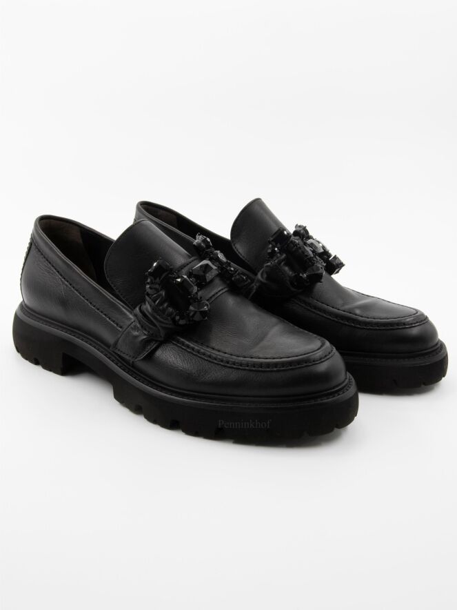 Een instapper van Kennel & Schmenger in de kleur zwart. Op de voorvoet is een grote decoratieve bit met grote zwarte strasstenen. De zwarte zool is gekarteld.