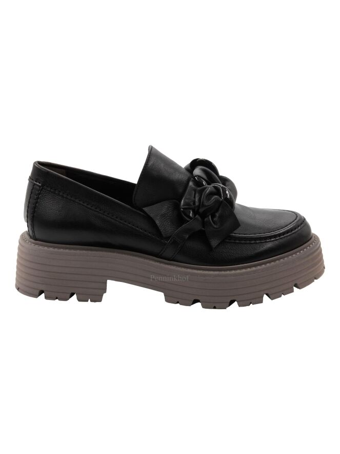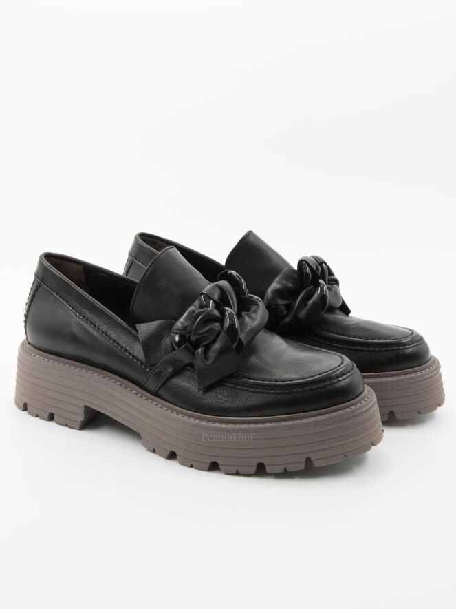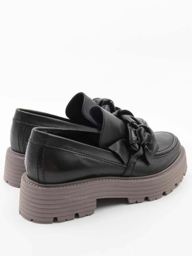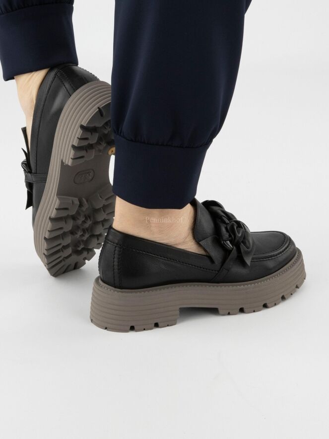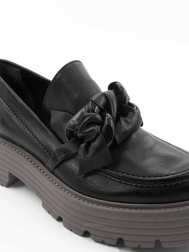 Een instapper van Kennel & Schmenger in de kleur zwart. Op de voorvoet is een decoratieve geknoopte band met 2 zwarte lakgespen. De gekartelde zool is in de kleur grijs.