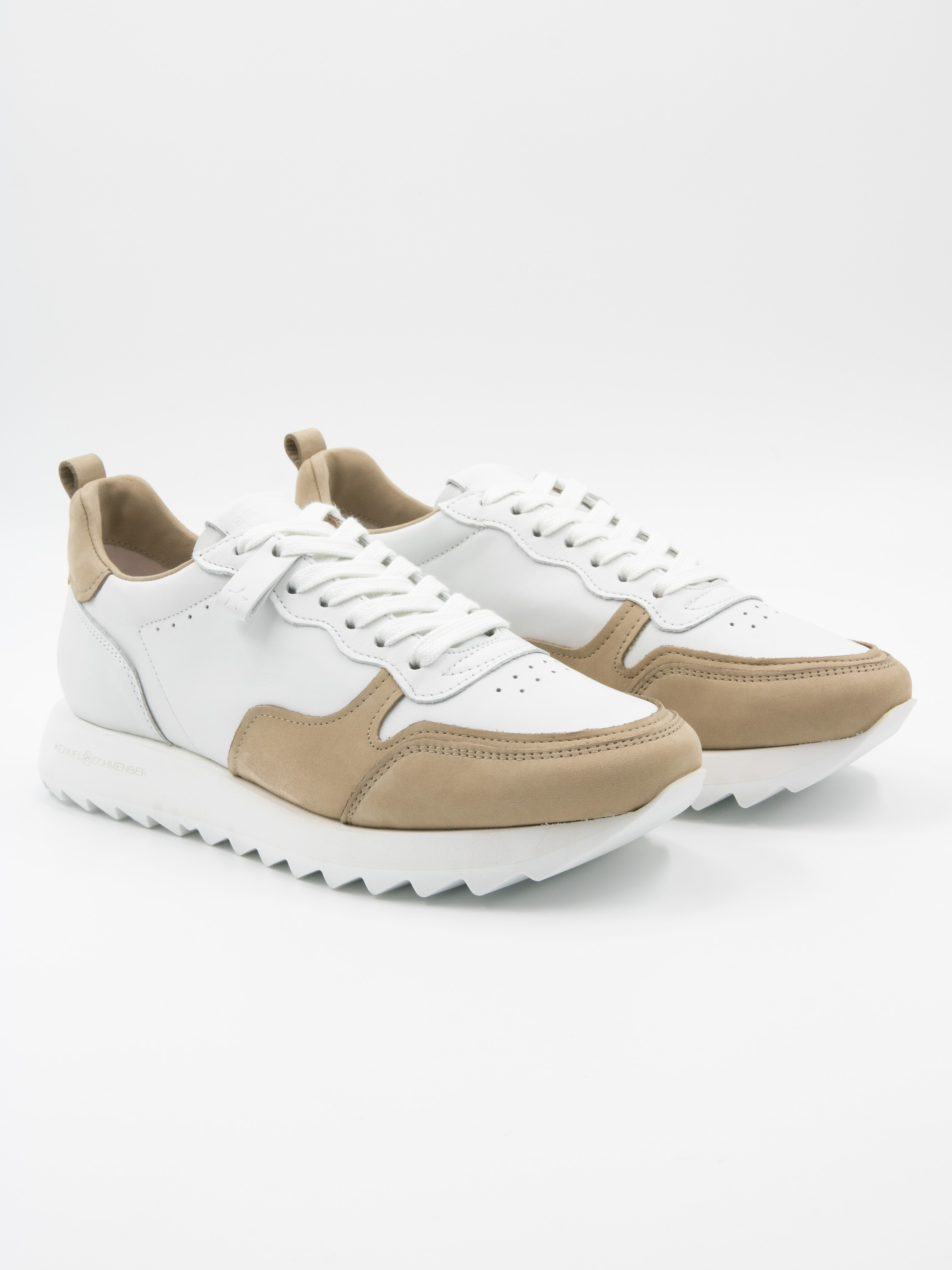 Een sneaker van Kennel & Schmenger in de kleur wit. Langs de rand van de voorvoet naar de zijkanten toe is een breed deel in een camoscio suède in een zandkleur. dit komt terug op de hiel en langs de binnenkant van de schachtrand. De witte zool is ruim gekarteld en de binnenkant is met leder gevoerd.