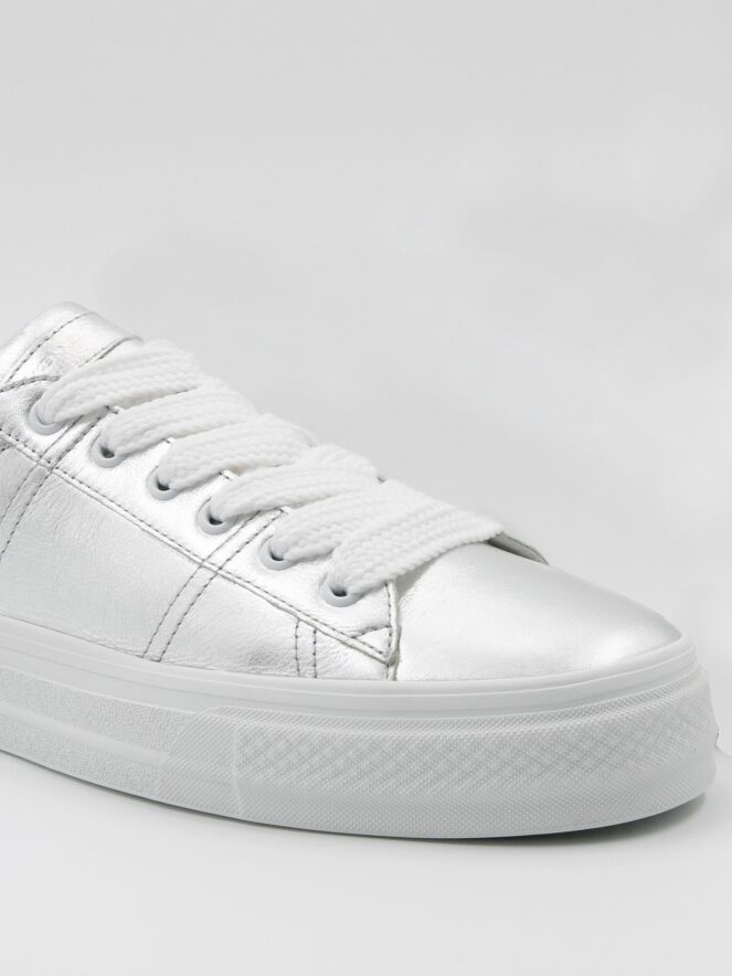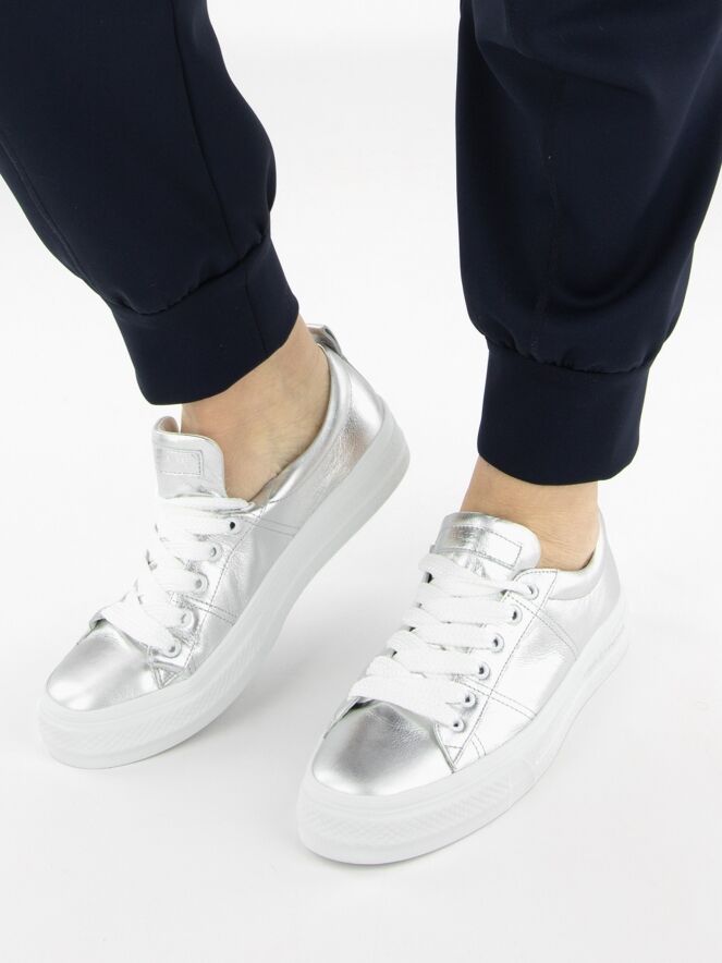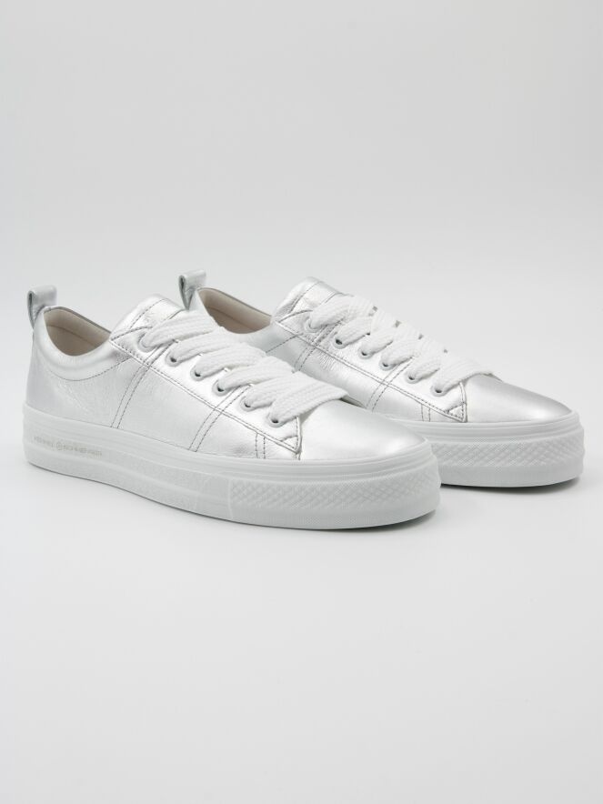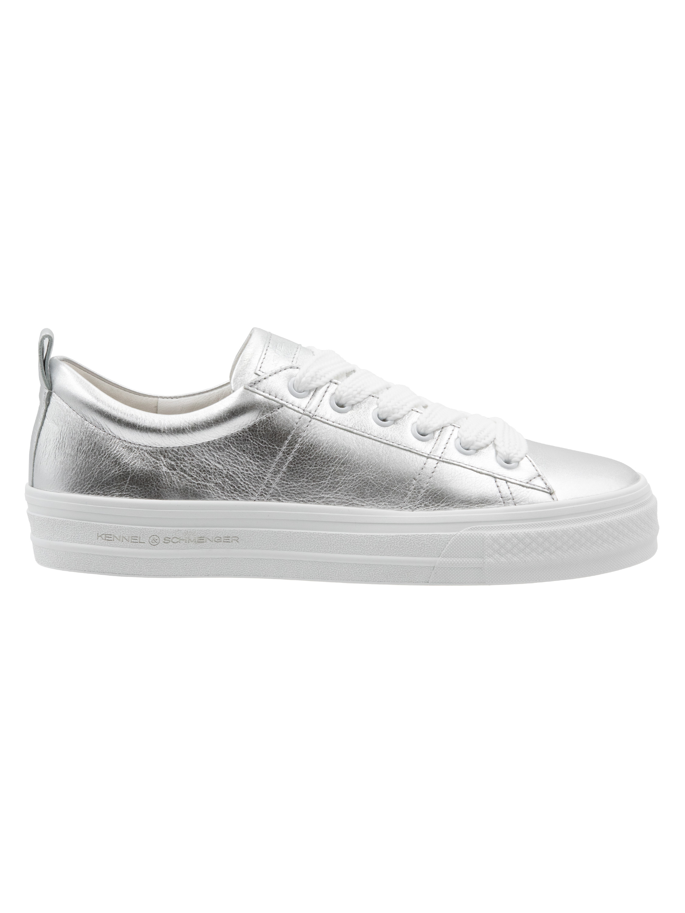 Een lage sneaker van Kennel & Schmenger in de kleur zilver. De sneaker heeft brede witte veters en een witte plateauzool. De binnenkant is met leder gevoerd.