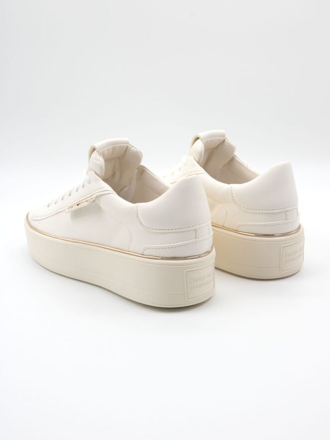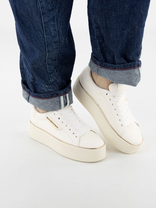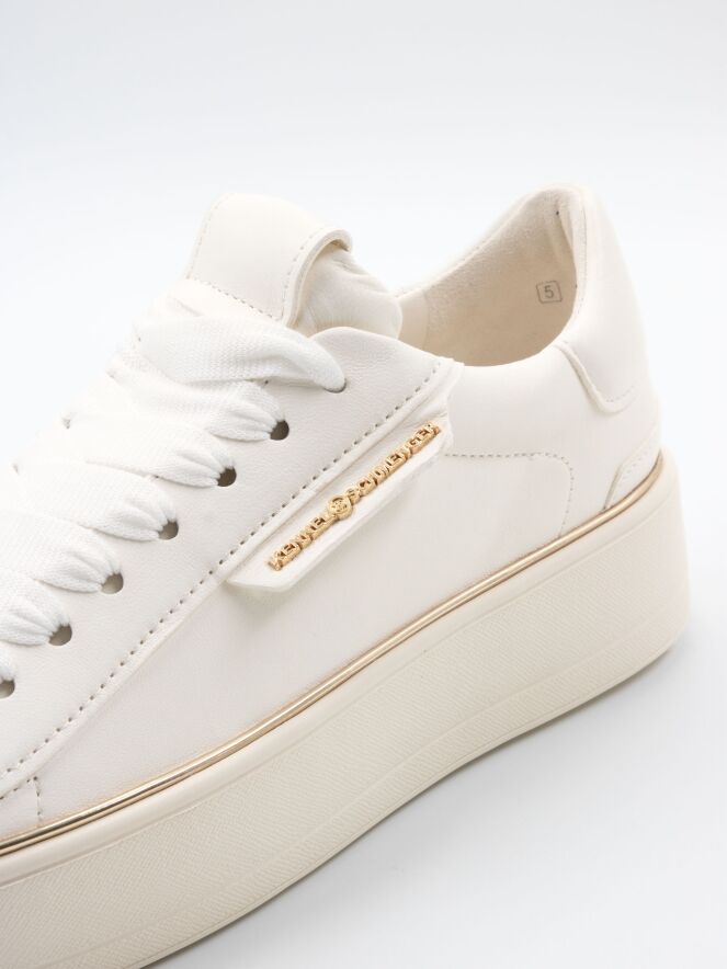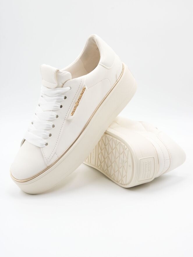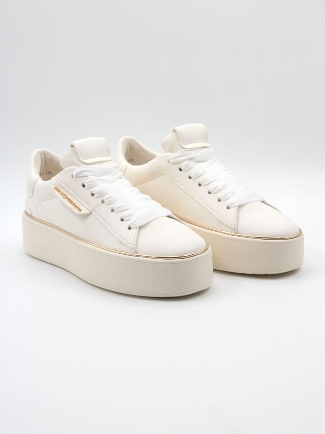 Een luxe sneaker van Kennel & Schmenger in een roomwitte kleur. Langs de roomwitte zool is een goudkleurige bies. De veters zijn in een witte mat satijnen stof. De binnenkant is met leder gevoerd.