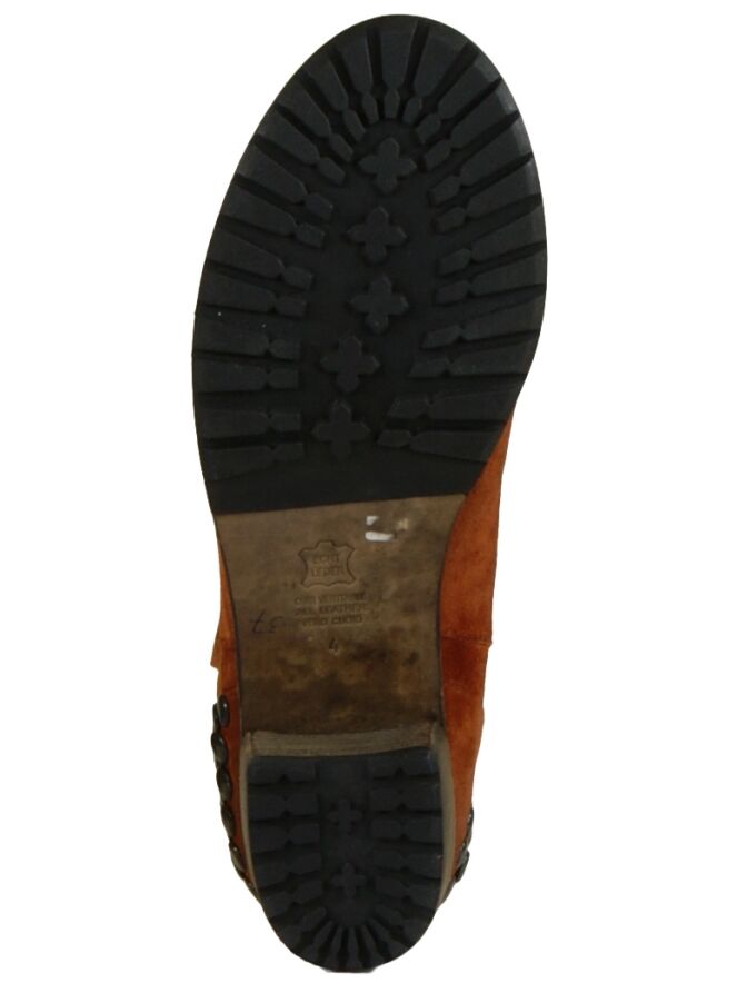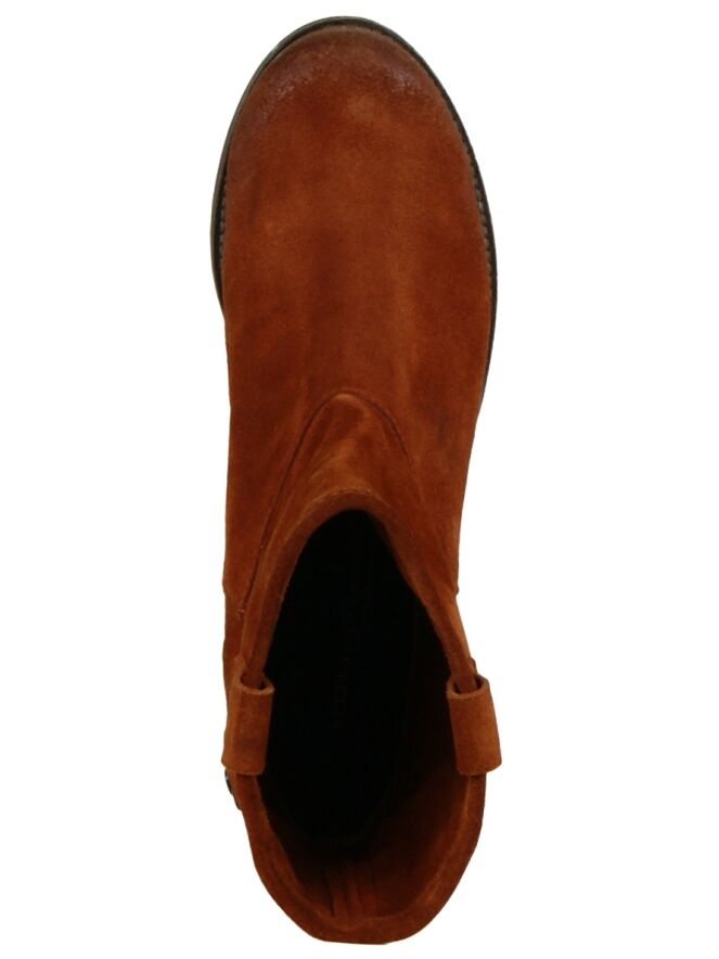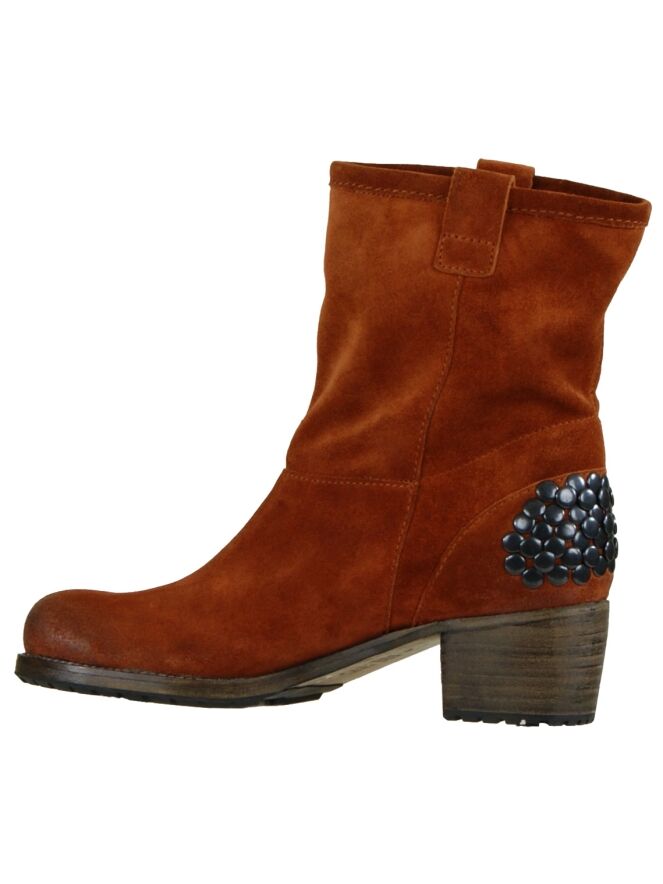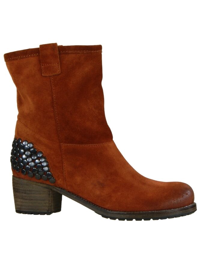 Een kort laarsje van het merk Kennel & Schmenger in de kleur roestbruin. Het suède van het laarsje is licht geschuurd. Op de hiel zijn platte ronde studs in de kleur zwart. Het laarsje is ongevoerd.