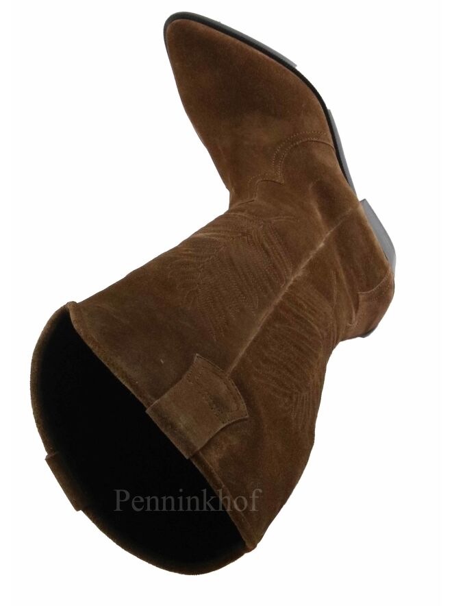 Een hoge western laars van Kennel & Schmenger in de kleur cognac. Aan de buitenzijde van de schacht is een bladeren design ingestikt. De laars heeft een spitse neus en de binnenkant is met leder gevoerd.