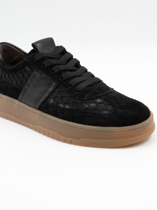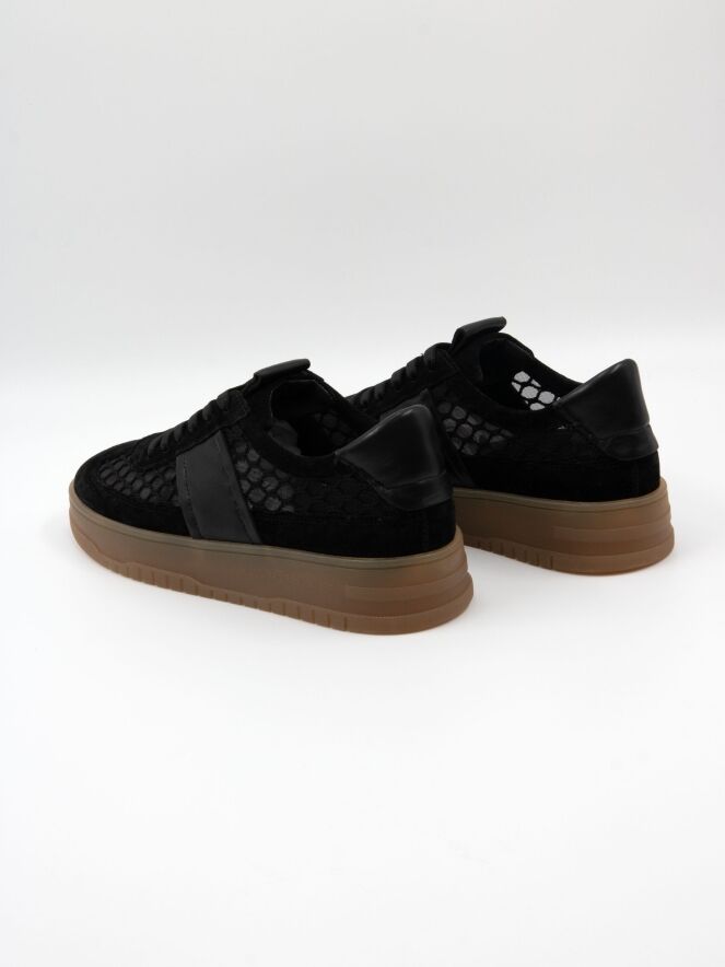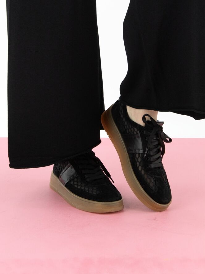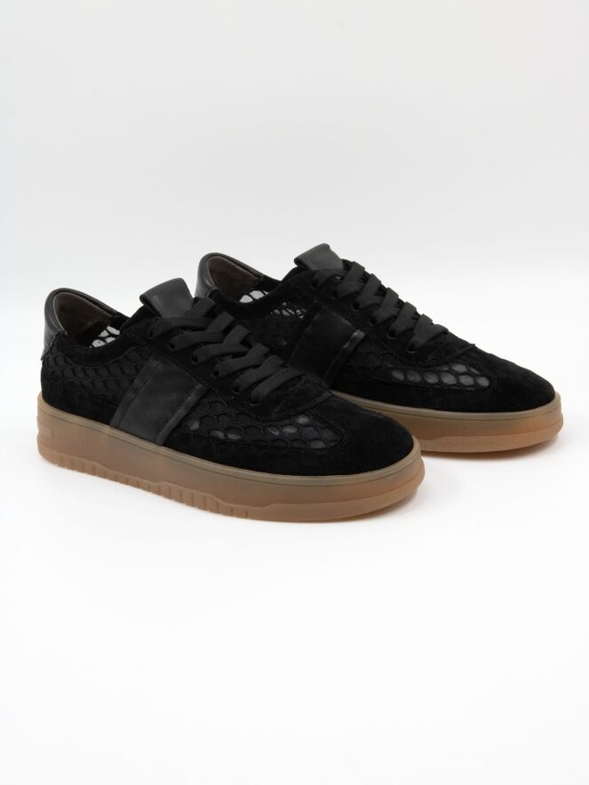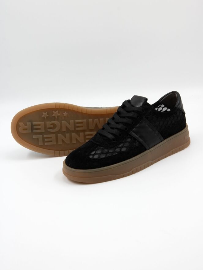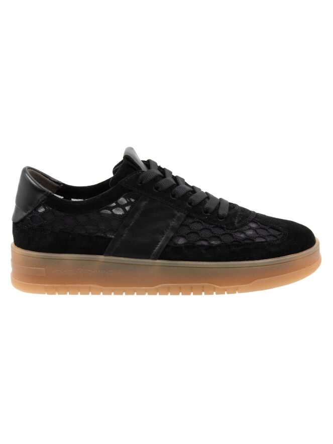 Een lage sneaker van Kennel und Schmenger in de kleur zwart. De sneaker is vervaardigd uit een transparante stof met een ruitenpatroon. De neus en de rand boven de zool zijn uitgevoerd in nubuck suède. Op de hiel is een leren inzetstuk aangebracht. De zool heeft een honingkleurige afwerking.