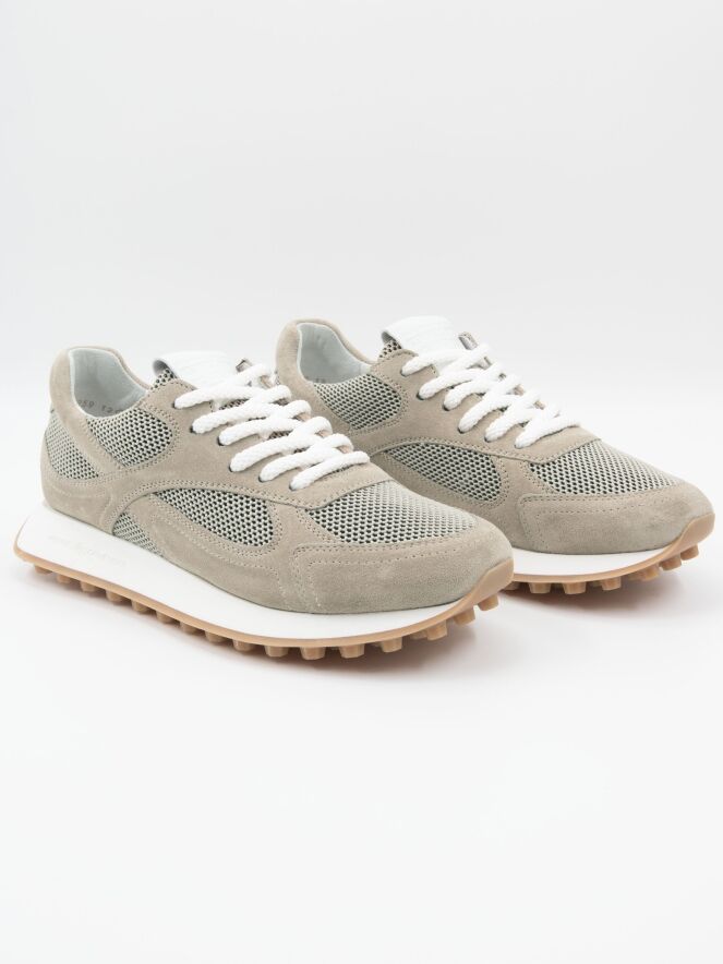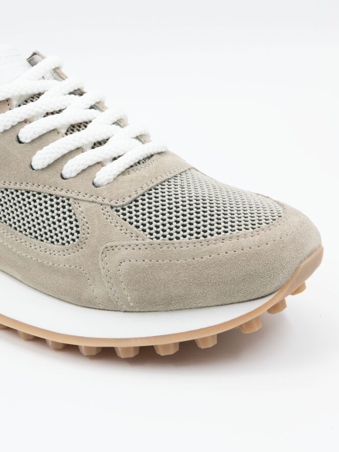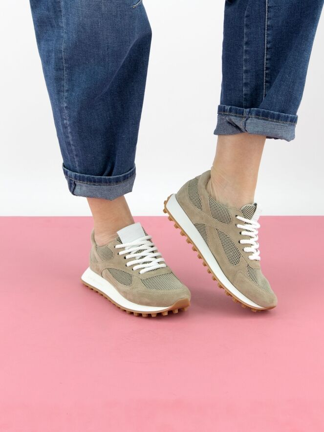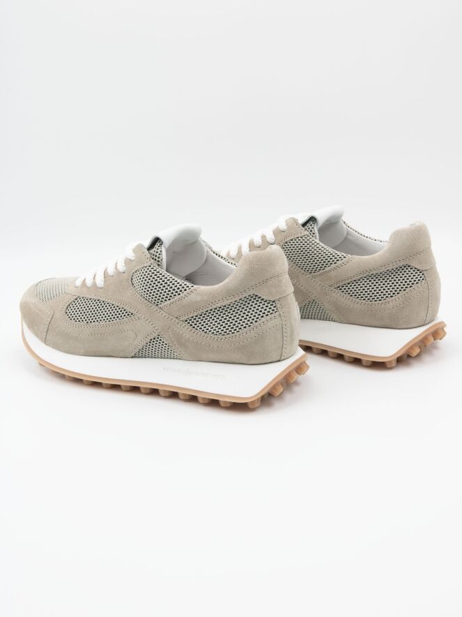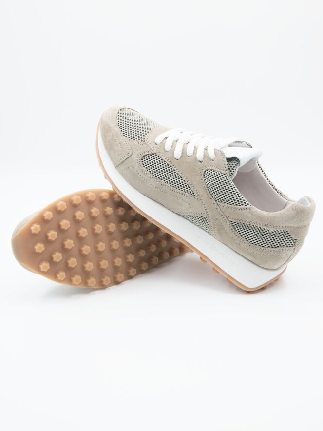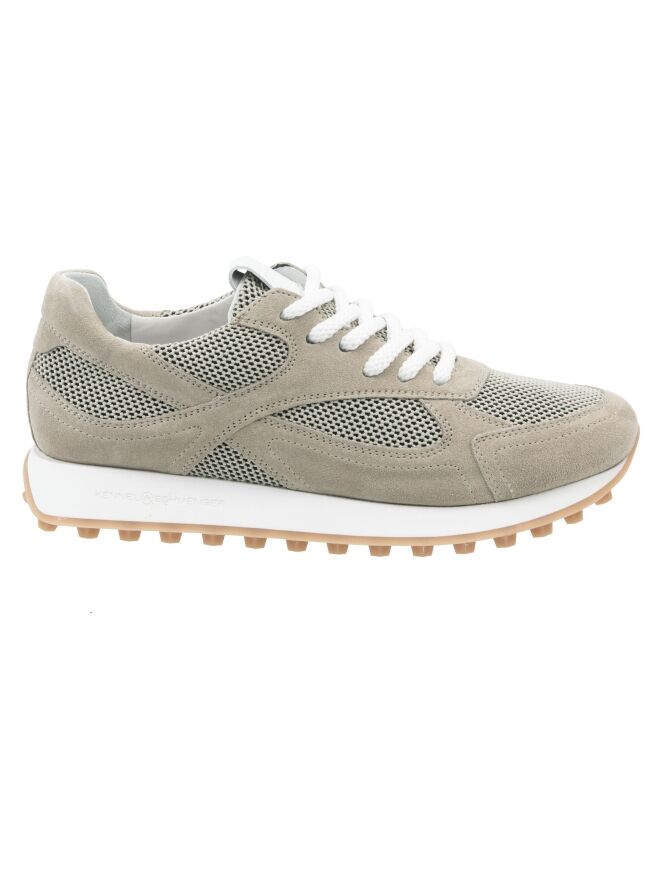 Een luxe sneaker van Kennel und Schmenger in de kleur zand. De sneaker is een combinatie van camoscio suède en een elastische stof met een netstructuur. De sneaker heeft een witte zool en witte veters.