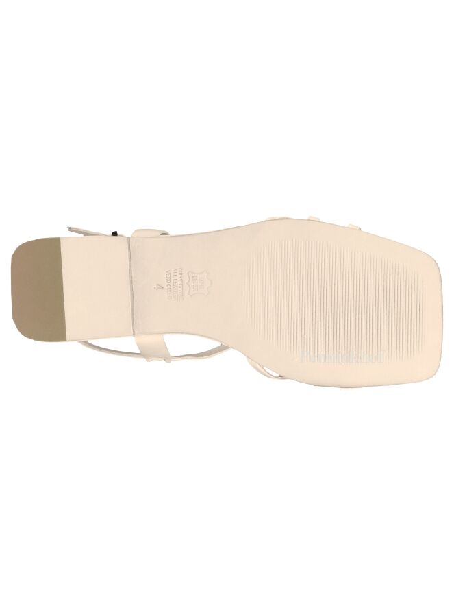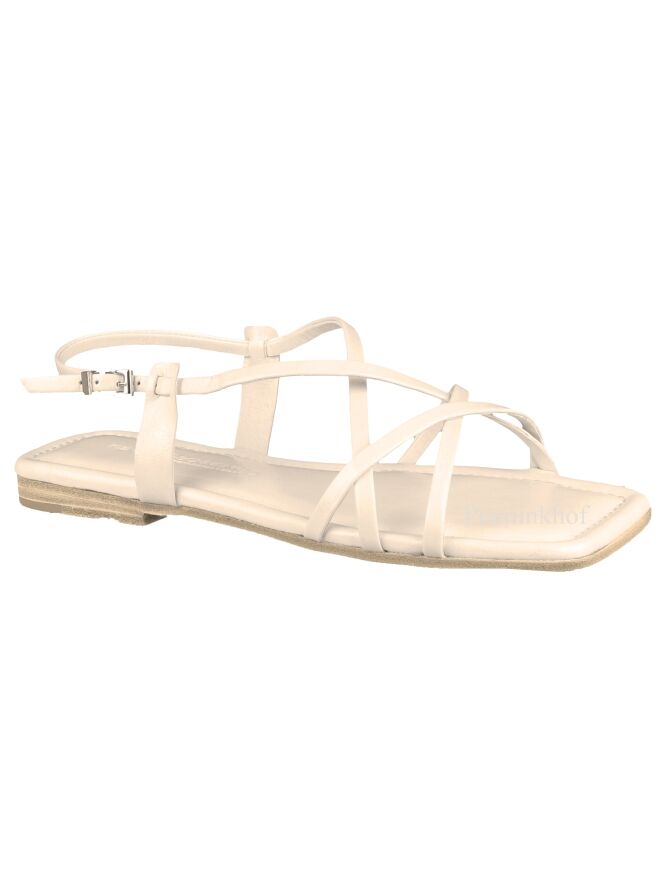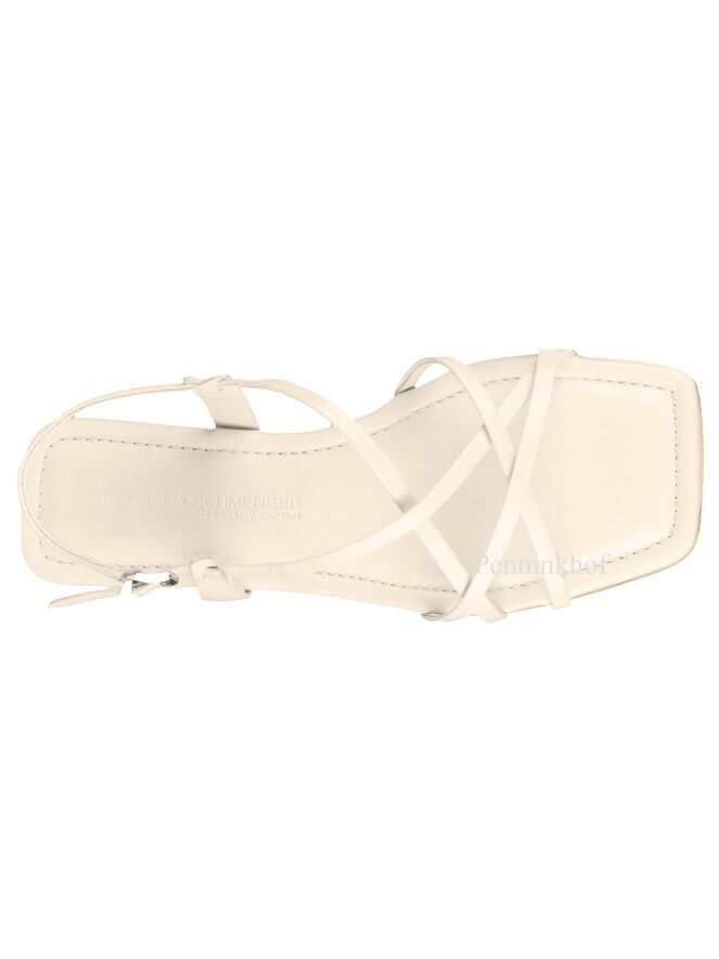 Een sandaal van Kennel & Schmenger in een roomwitte kleur. Over de voorvoet zijn meerdere smalle biesjes gekruist. Het hielbandje is verstelbaar. De sandaal heeft een vierkante neus.