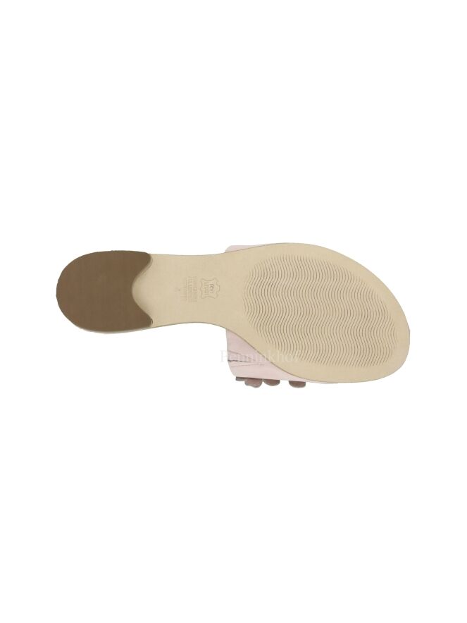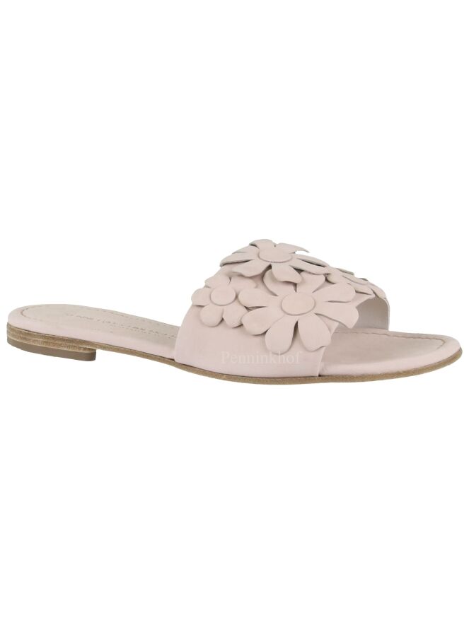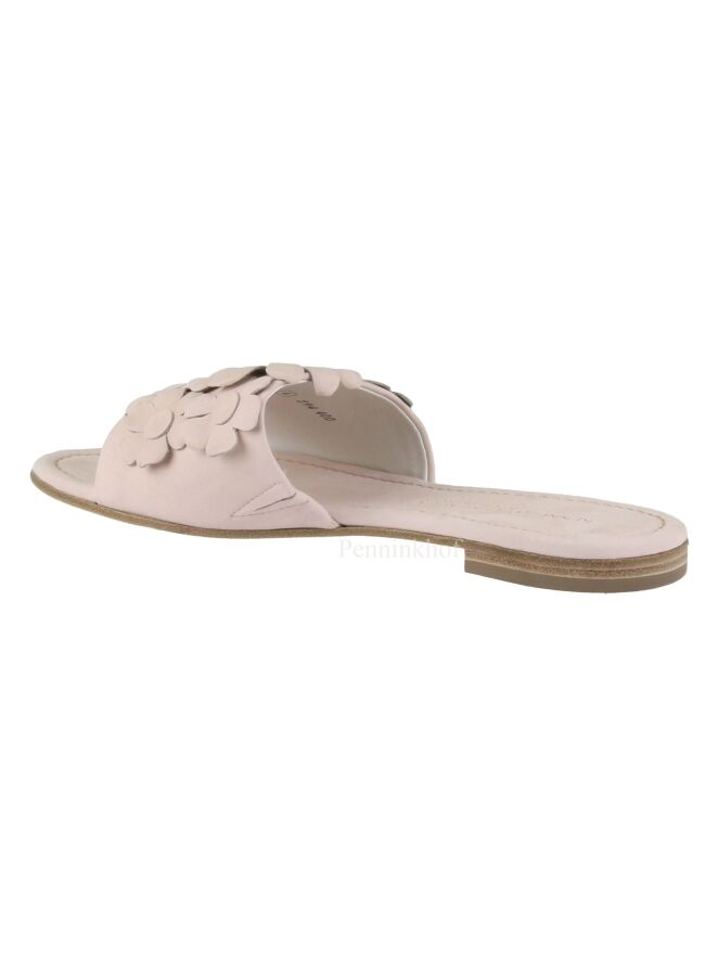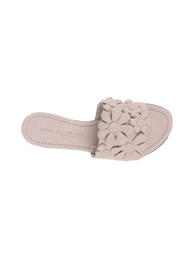 Een slippertje van Kennel & Schmenger in de kleur pastel roze. op de brede band over de voorvoet zijn decoratieve bloemetjes. Het slippertje heeft een ronde neus.