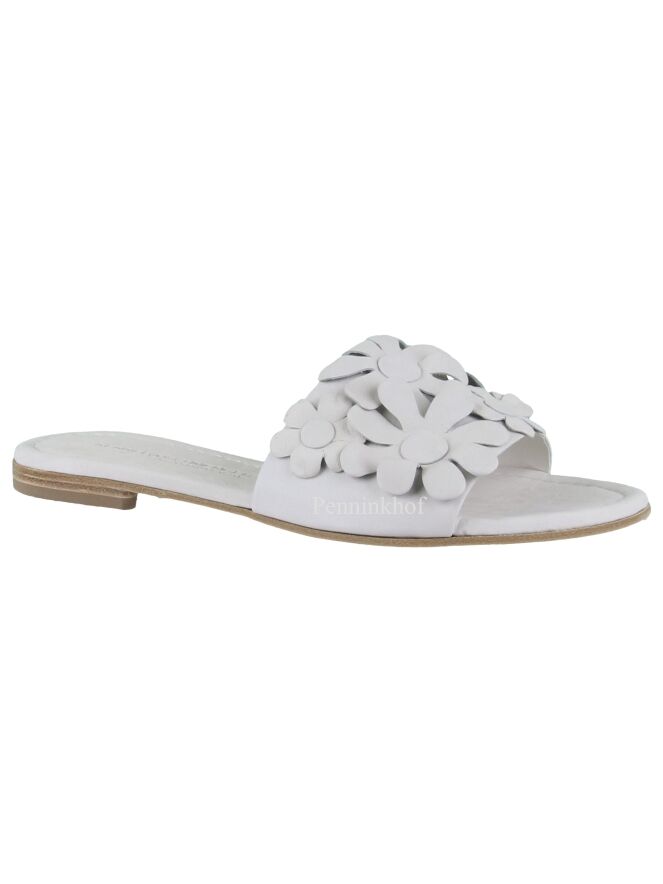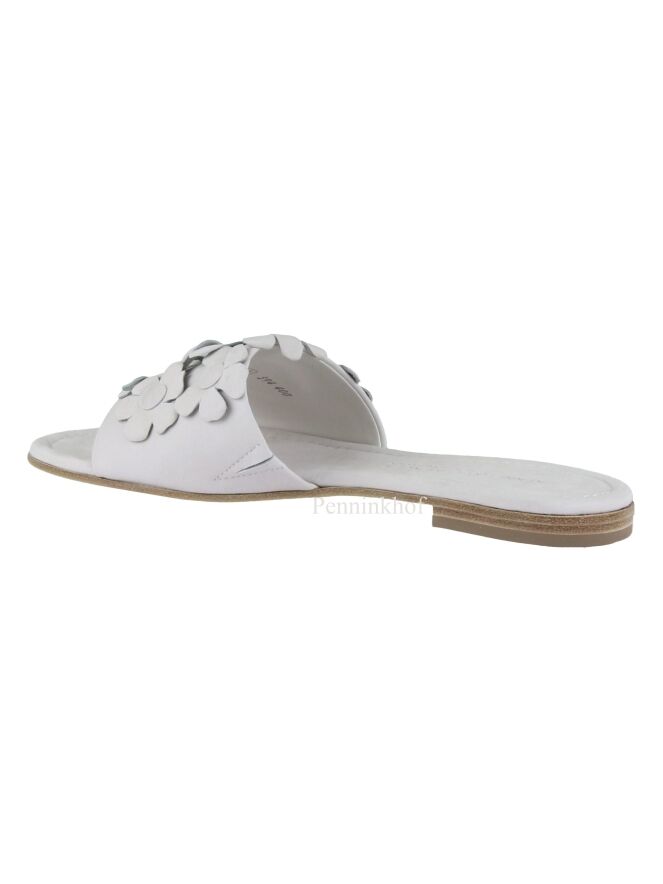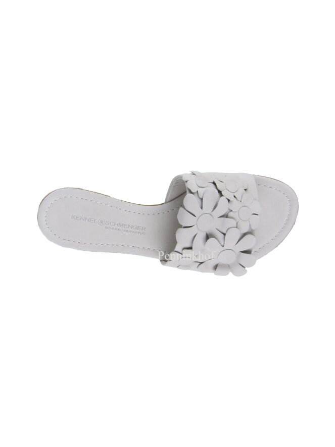 Een slippertje van Kennel & Schmenger in de kleur lichtgrijs. op de brede band over de voorvoet zijn decoratieve bloemetjes. Het slippertje heeft een ronde neus.