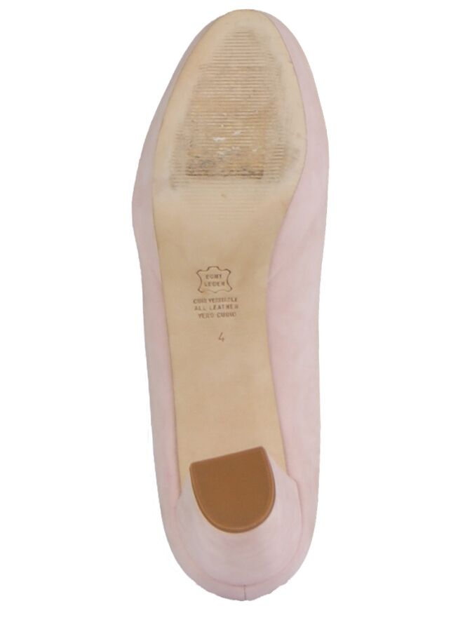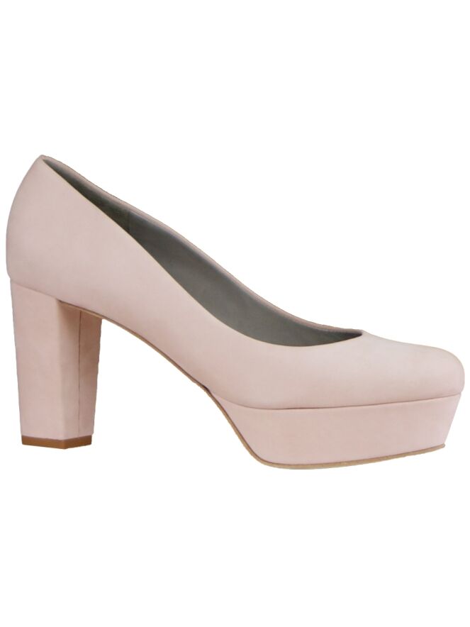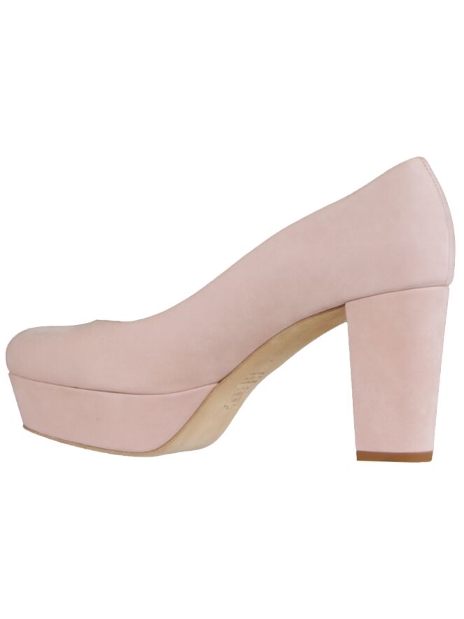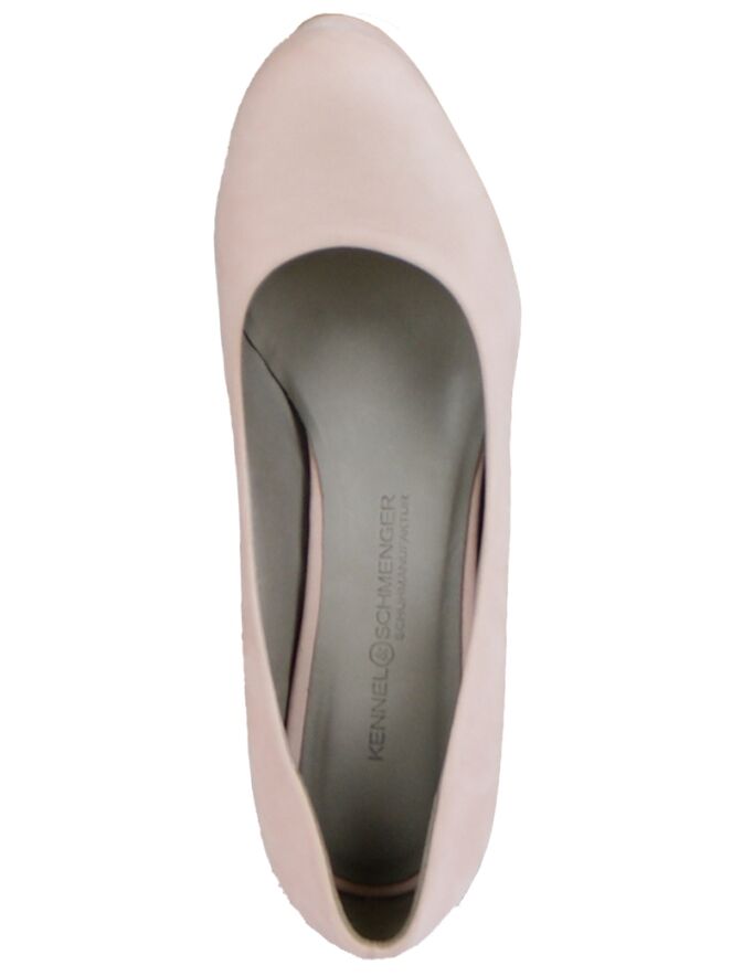 Een pump van K & S in een helder pastel roze kleur op een plateauzool. Het neusje loopt rond en de pump heeft een blokhak die bekleed is in hetzelfde materiaal als de pump zelf