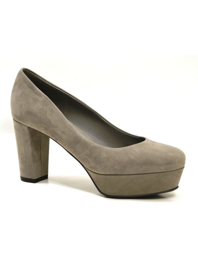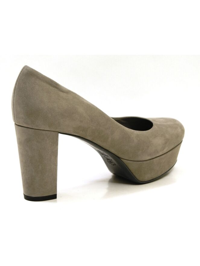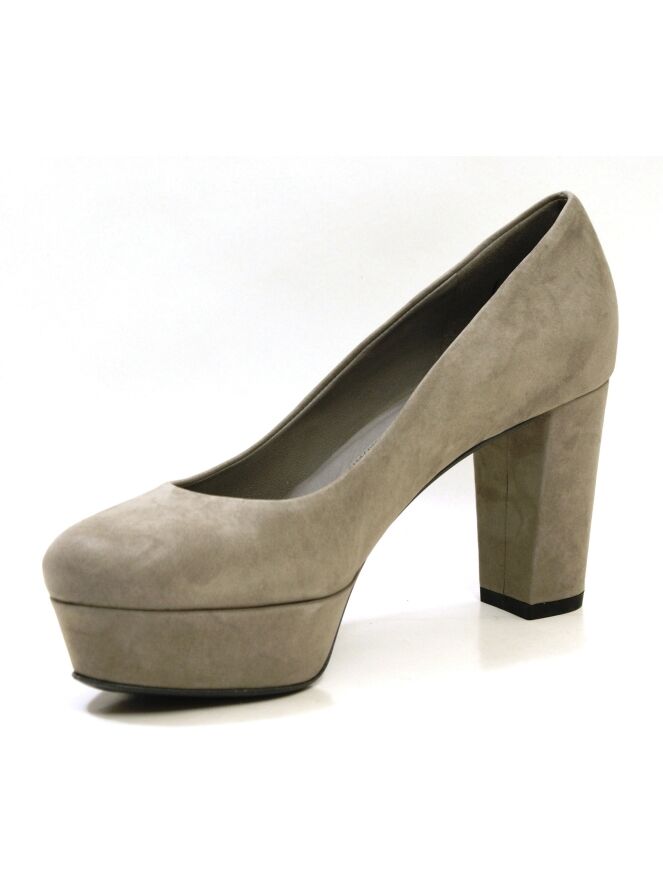 Een pump van K & S in een taupe kleur op een plateauzool. Het neusje loopt rond en de pump heeft een blokhak die bekleed is in hetzelfde materiaal als de pump zelf