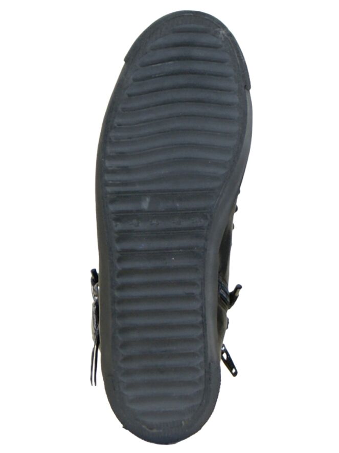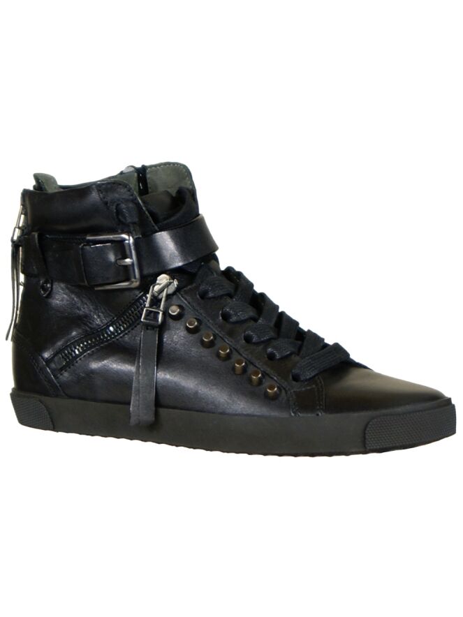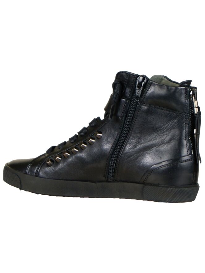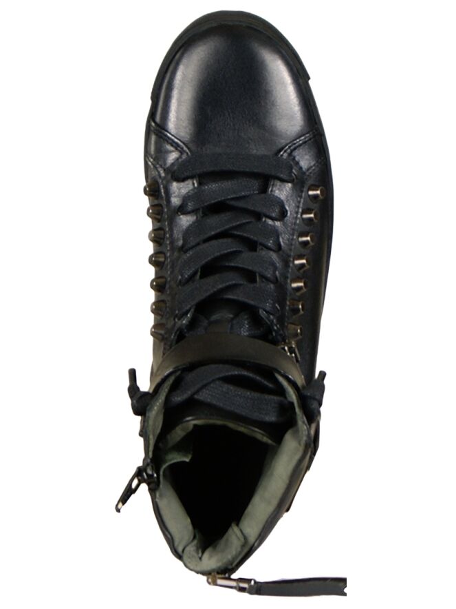 Een hoge sneaker van Kennel & Schmenger in de kleur zwart. Langs de veters zijn decoratieve studs. Aan de buitenzijde is langs de schacht een riempje met een zilver kleurige gesp. Op de hiel is een rits. De binnenkant is met leder gevoerd.