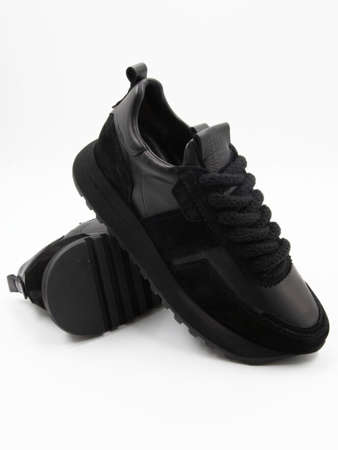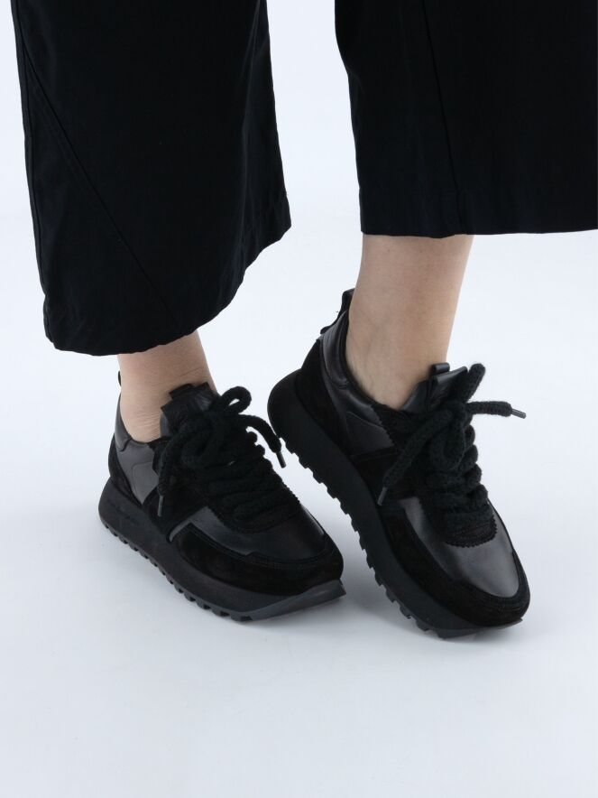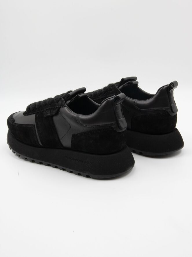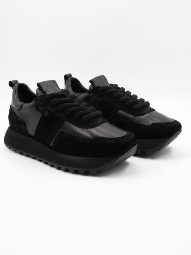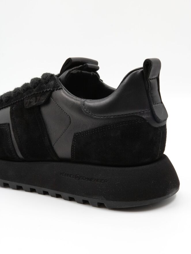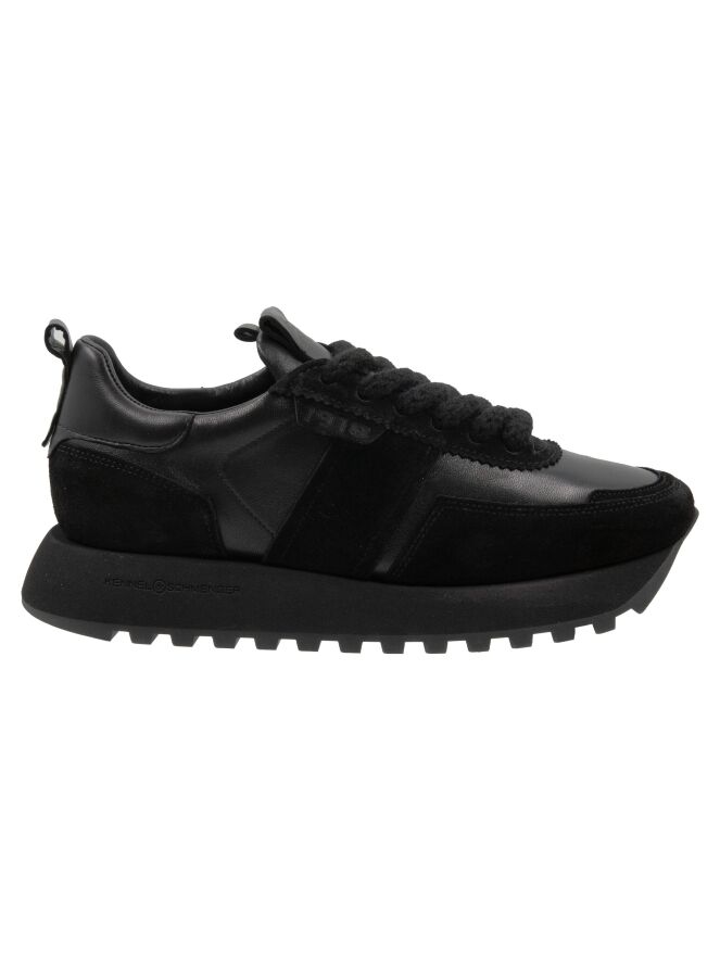 Een sneaker van Kennel & Schmenger in een zwarte kleur. Langs de rand van de neus naar de zijkanten, bij de hiel en langs de veters is een sportieve zwarte velour suède. De zool is iets verhoogd bij de hiel en de binnenkant is met leder gevoerd