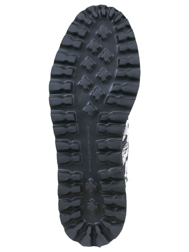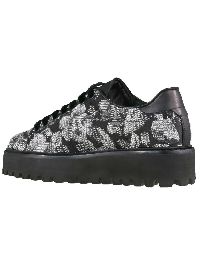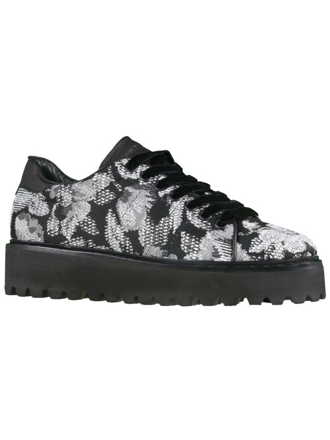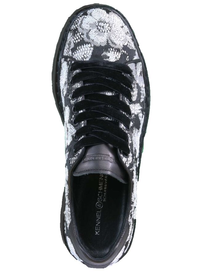 Een instapper van het merk Kennel & Schmenger in een grafische bloemenprint met de kleuren zwart en wit. De veters zijn van een fluwelen stof. Langs de randen van de stof zijn smalle lederen biesjes. De zool is gekarteld. De binnenkant is met leder gevoerd.