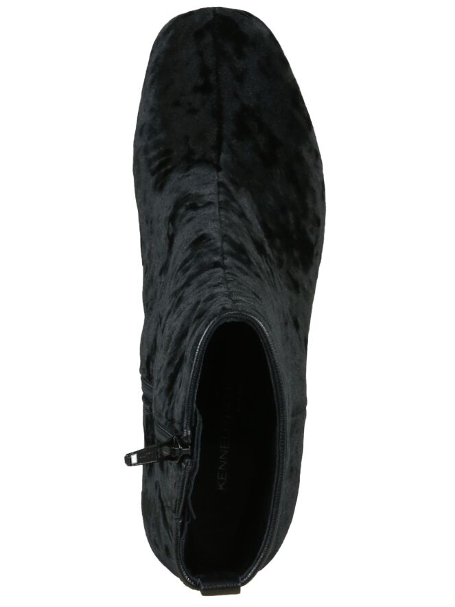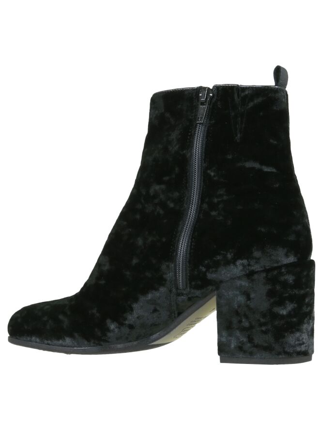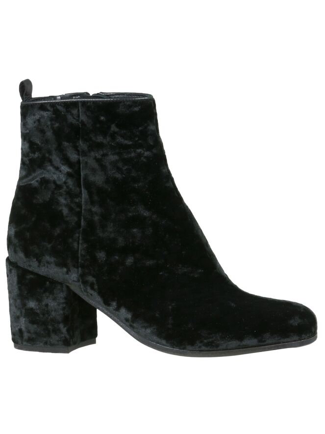 Een enkellaarsje van het merk Kennel & Schmenger in een fluwelen stof in de kleur zwart. Het laarsje heeft een geronde vierkante neus. De sportieve blokhak is in dezelfde stof als het laarsje bekleed. De binnenkant is met leder gevoerd.
