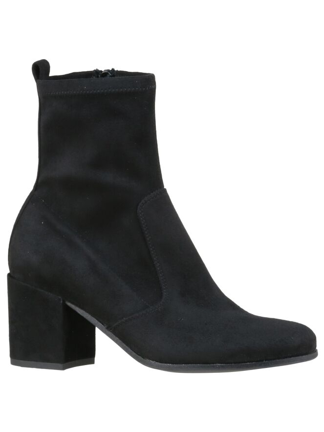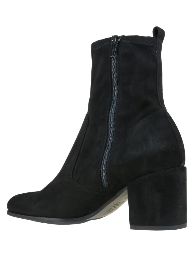 Een enkellaarsje van het merk Kennel & Schmenger in de kleur zwart. Het laarsje heeft een ronde neus. De blokhak is in hetzelfde suède bekleed als het laarsje. De binnenkant is met satijn bekleed.