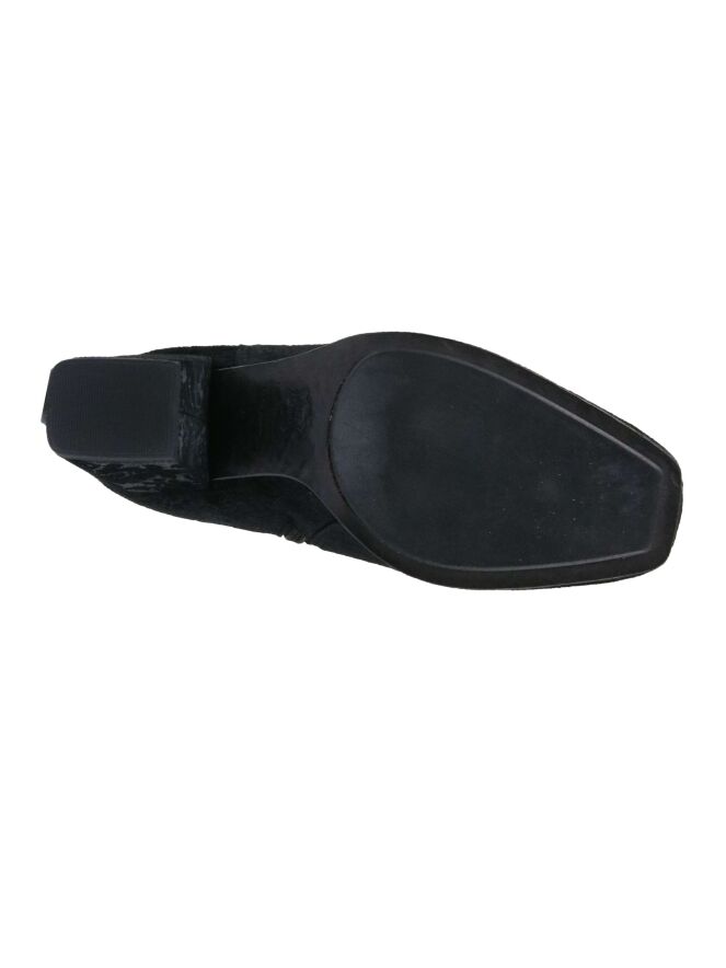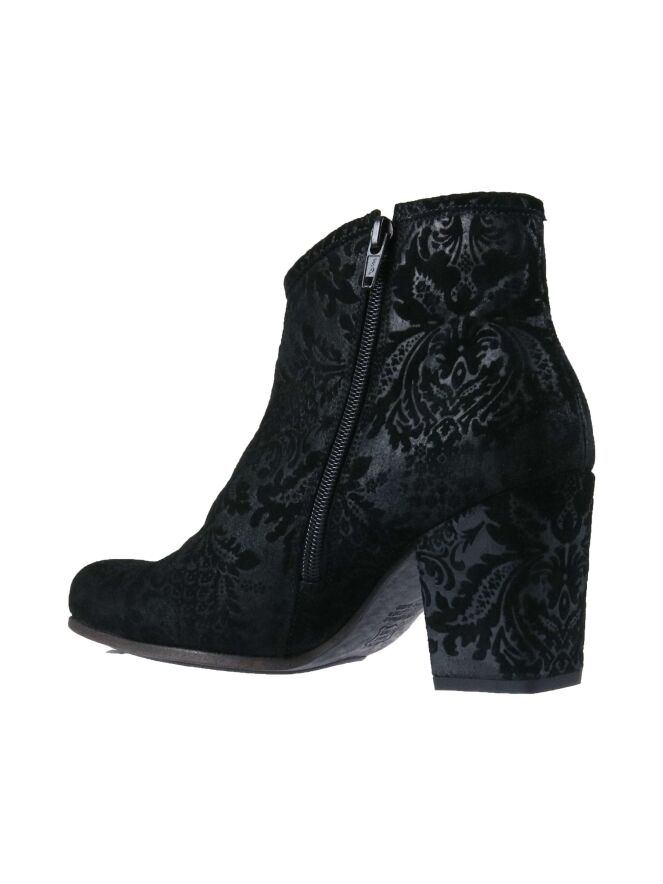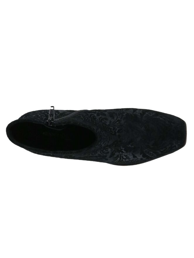 Een kort laarsje van Kennel & Schmenger in de kleur zwart. In het suède is een brooks print. Het laarsje heeft een vierkante neus en een blokhak die is bekleed in hetzelfde materiaal als het laarsje. De binnenkant is met leder gevoerd.