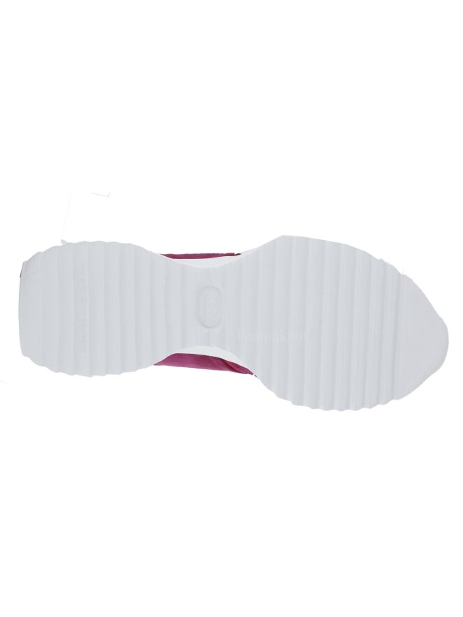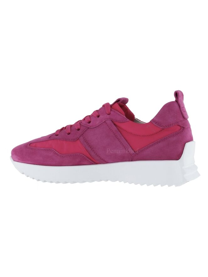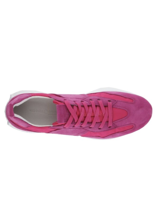 Een sneaker van Kennel & Schmenger in een fuchsia kleur. Langs de zijkanten zijn enkele delen in een fuchsia kleurige parachute stof. De gekartelde zool is in de kleur wit. De binnenkant is met leder gevoerd.