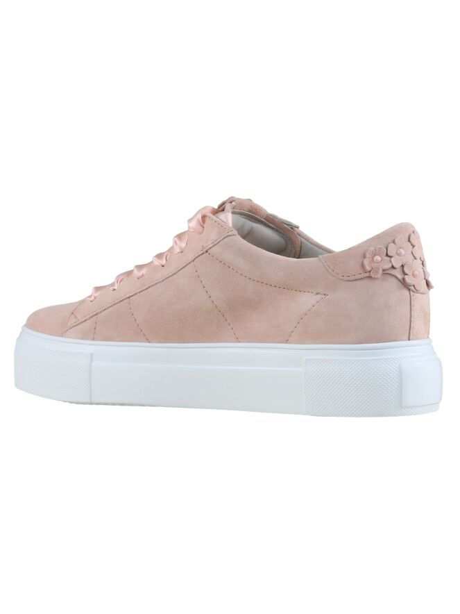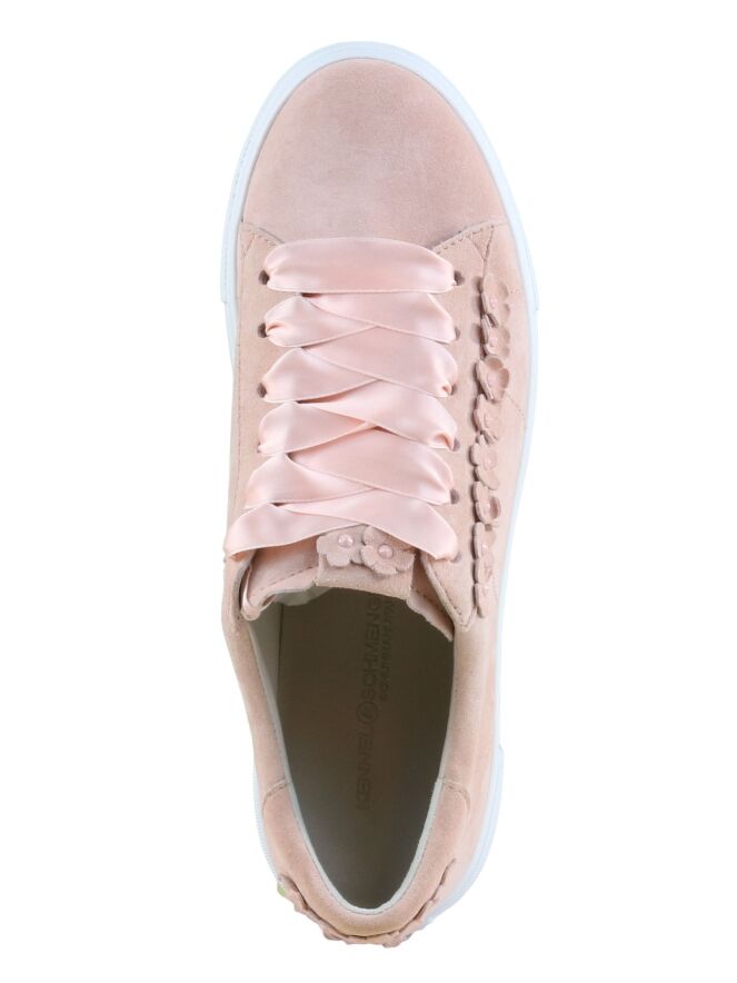 Een lage sneaker van Kennel & Schmenger in een pastel roze kleur. De sneaker heeft satijnen veters. Langs de veters en op de hiel zijn decoratieve suède bloemetjes. De sportieve witte zool is glad. De binnenkant is met leder gevoerd en de binnenzool is uitneembaar.