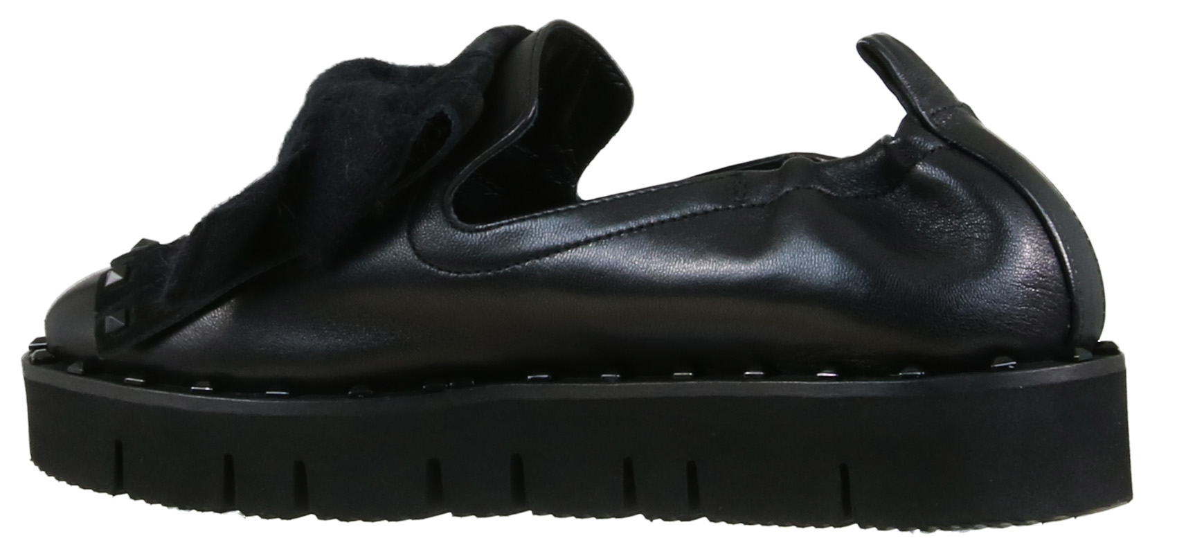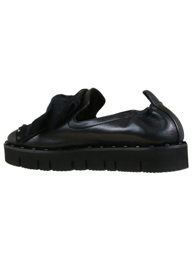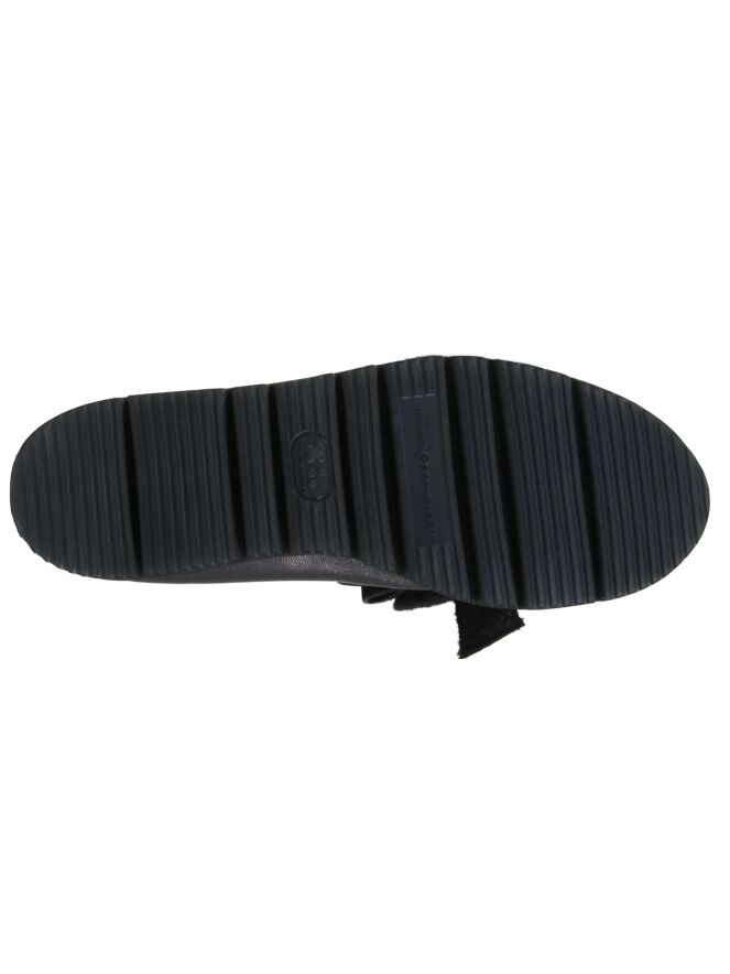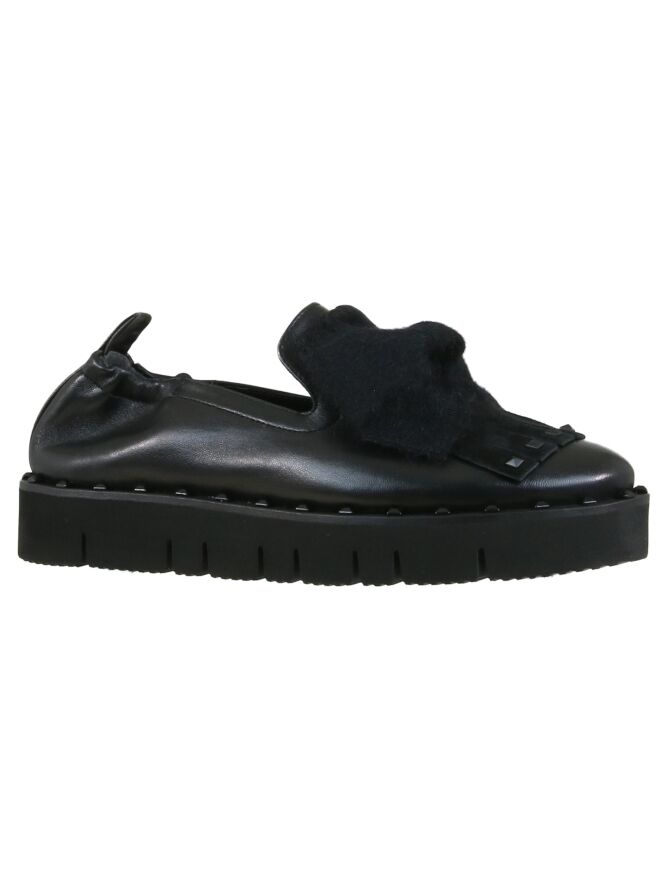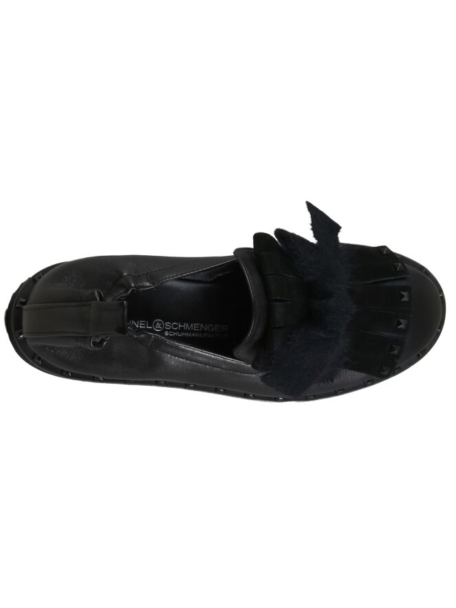 Een luxe instapper van Kennel & Schmenger in een zwart leder. Over de voorvoet is een jamboree met een decoratieve jute strik. In de rand van de zijkanten bij de hiel is elastiek. De rand van de gekartelde zool heeft zwarte studs. De binnenkant is deels met leder gevoerd.