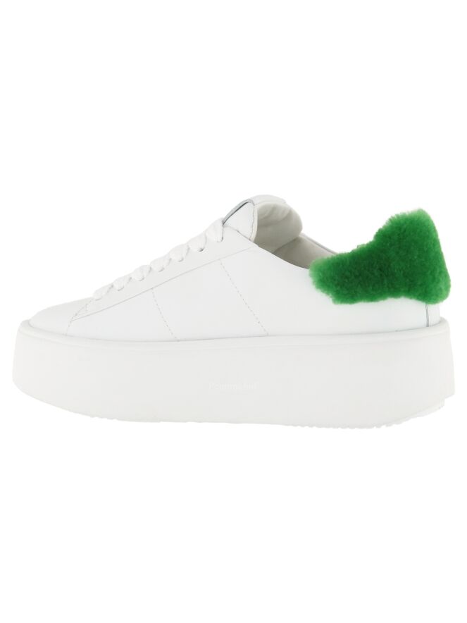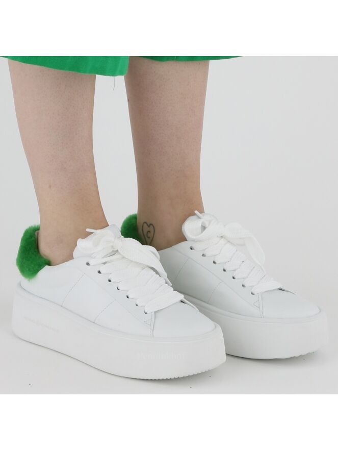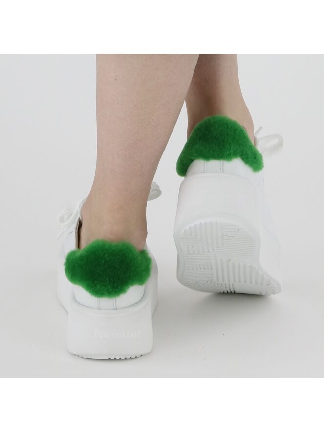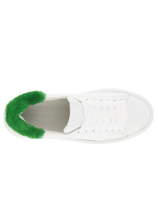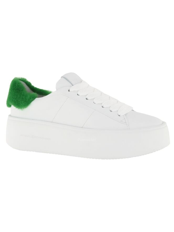 Een sneaker van Kennel & Schmenger in de kleur wit. Op de hiel is een groen stuk fake fur verwerkt. De plateauzool is in de kleur wit. De binnenkant is met leder gevoerd.