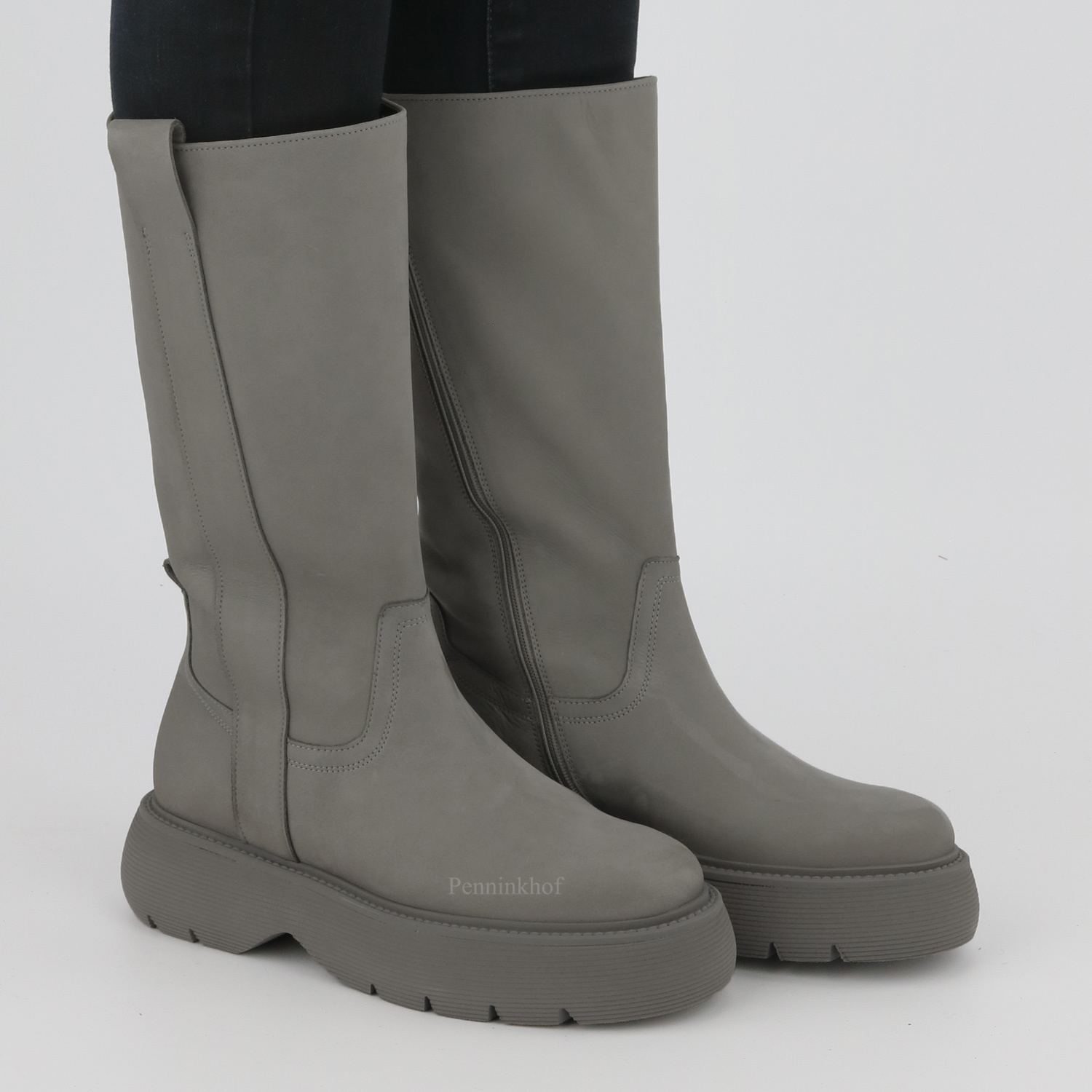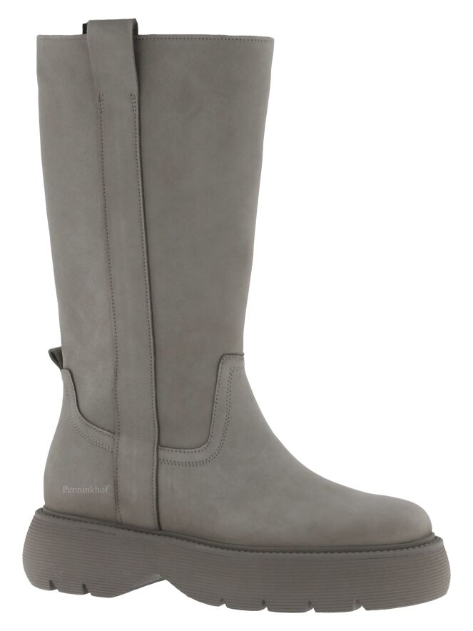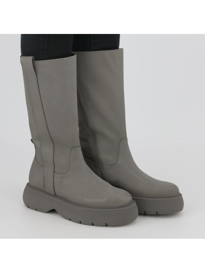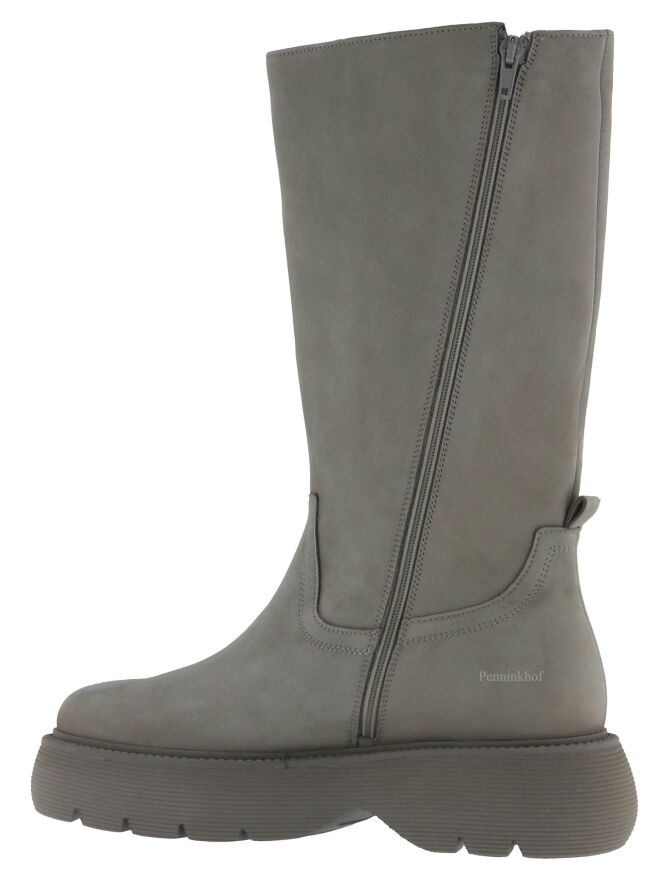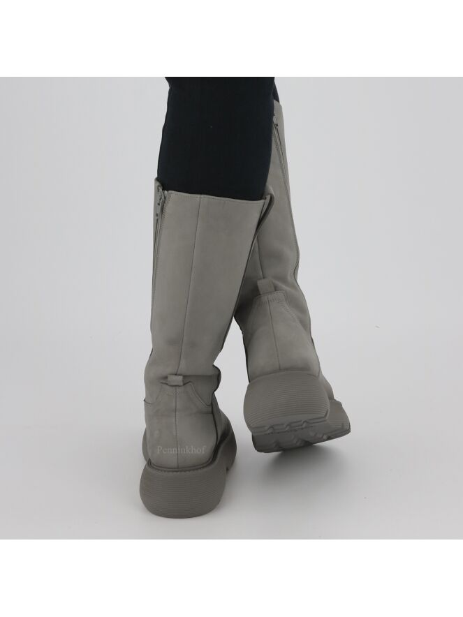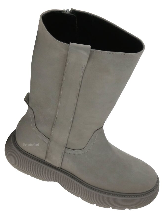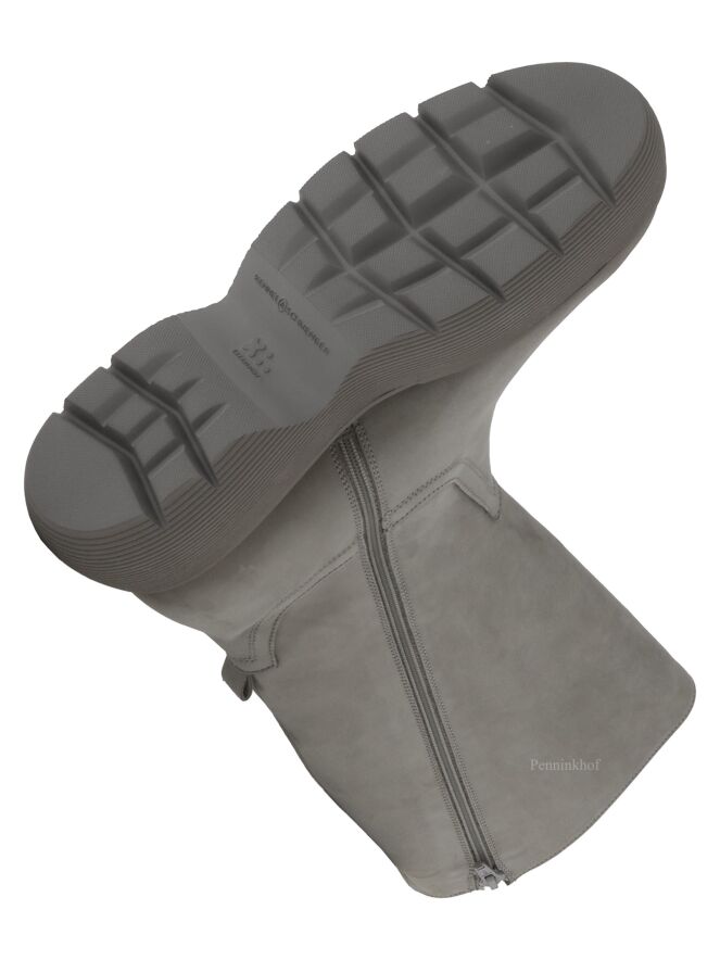 Een halfhoge laars van Kennel & Schmenger in de kleur grijs. De laars heeft een zwarte plateauzool die fijn geribbeld is. Aan de binnenzijde is een diagonale rits over de gehele lengte van de schacht. De binnenkant van de schacht is gevoerd met leder.