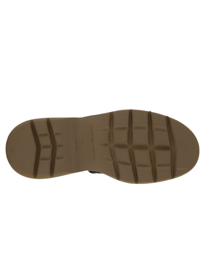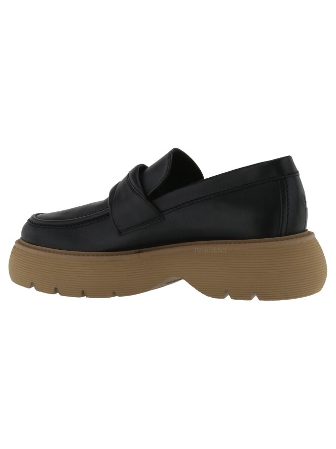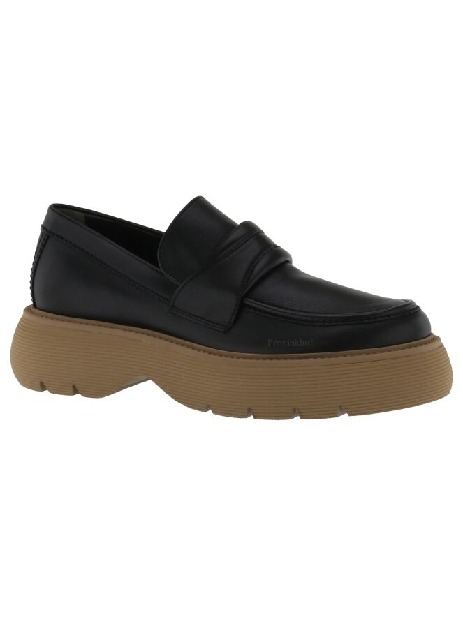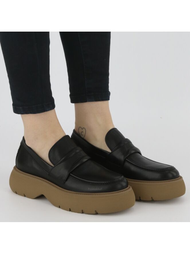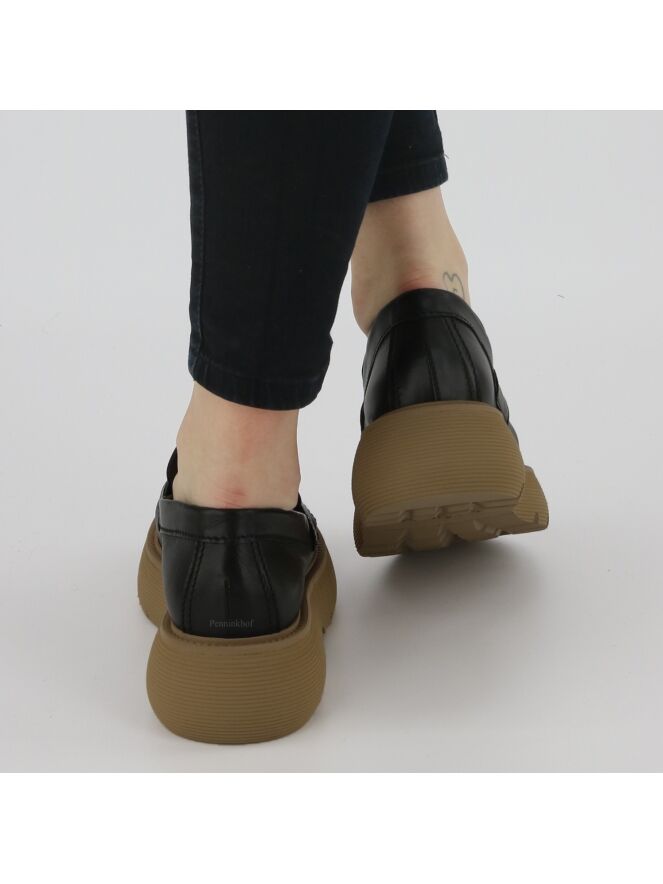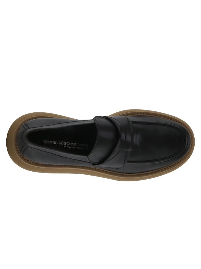 Een instapper van Kennel & schmenger in de kleur zwart. Op de voorvoet is een brede band. De stoere zool in een camel kleur is gekarteld. De binnenkant is met leder gevoerd.