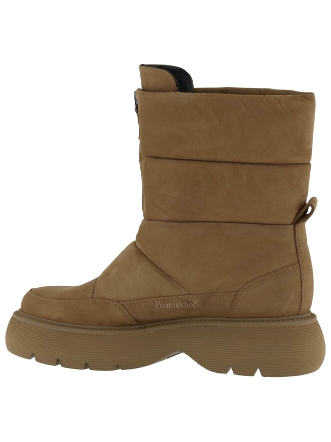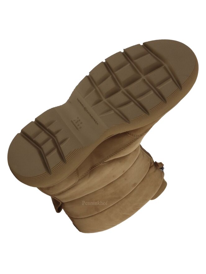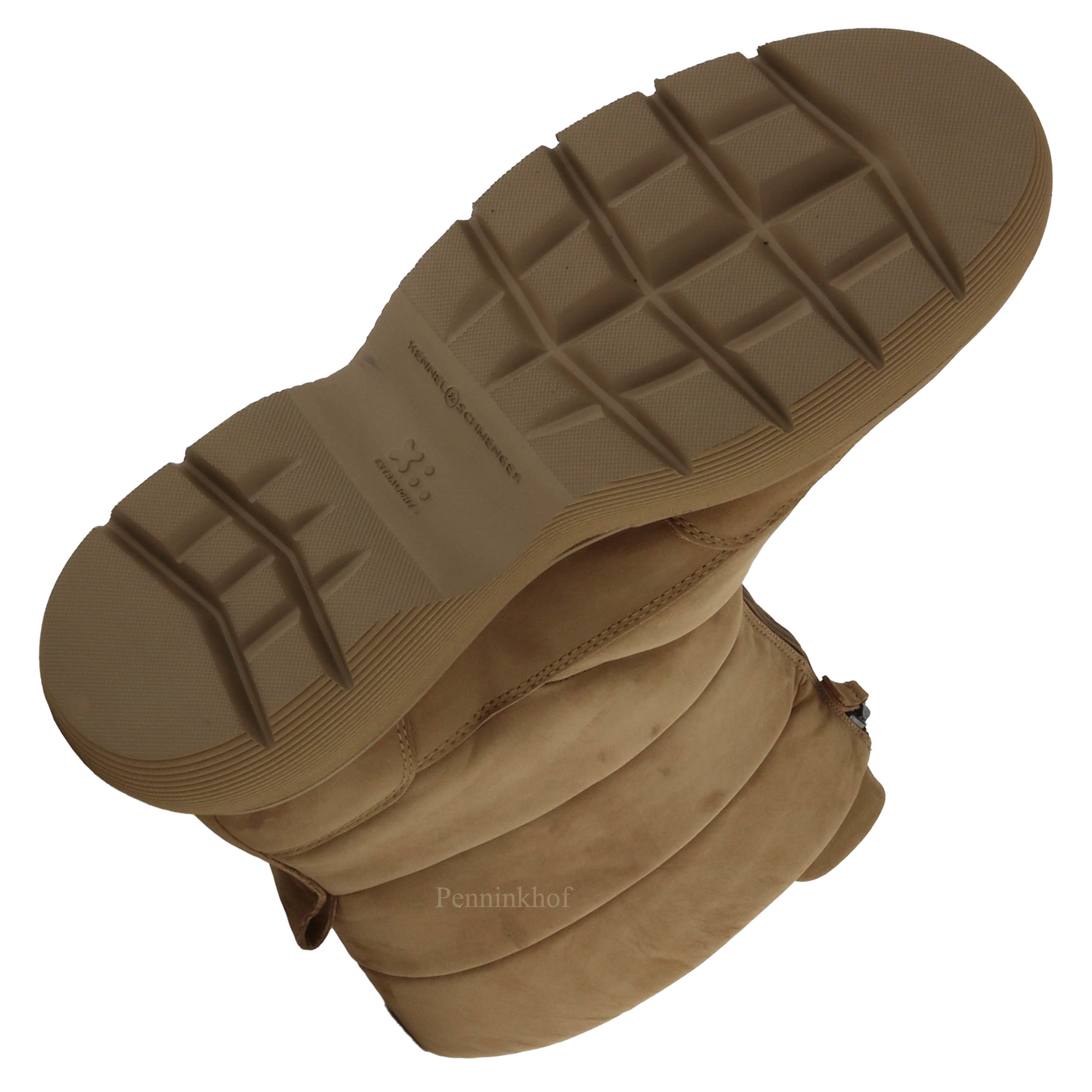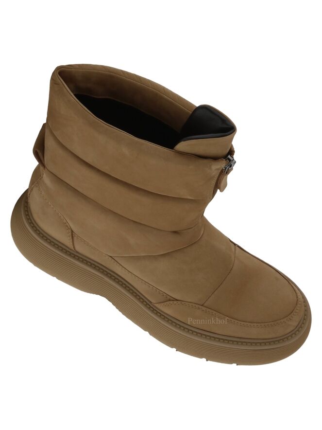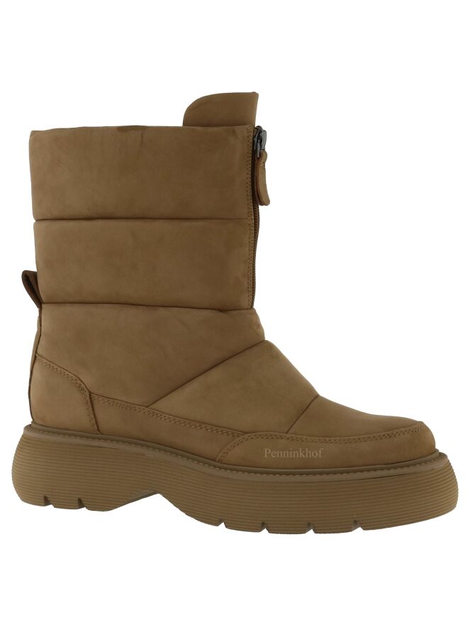 Een korte snowboot van Kennel & Schmenger in de kleur camel. De sportieve zool is in een camel kleur. Aan de voorzijde van de schacht is een korte rits. De snowboot heeft 4 horizontale decoratieve stiknaden. De binnenkant is met leder gevoerd.