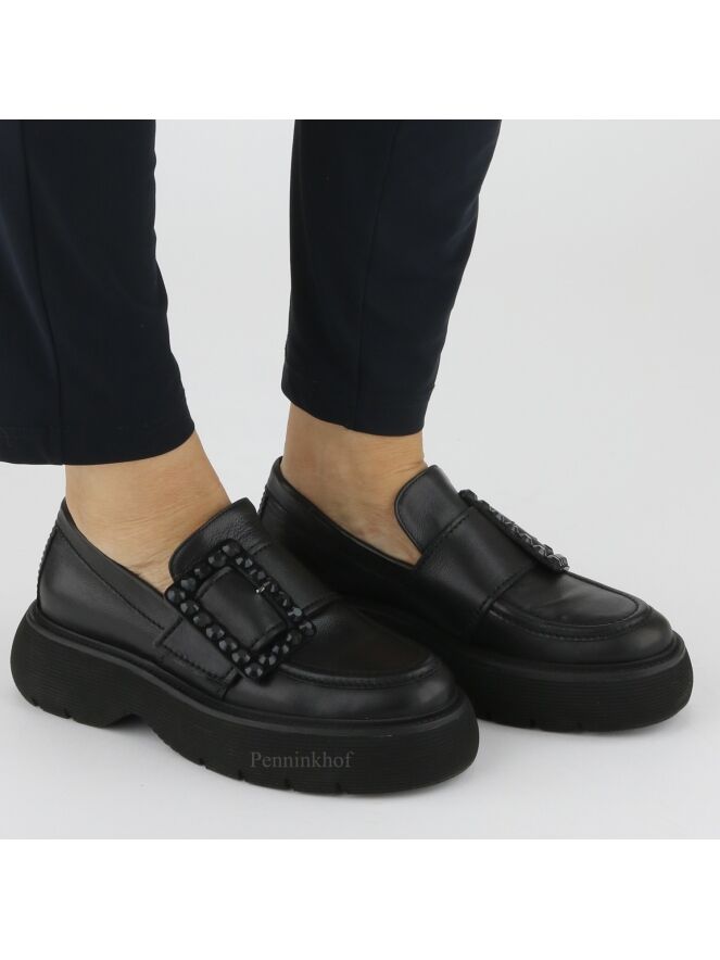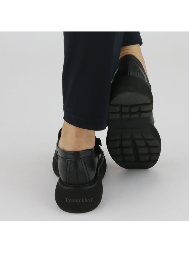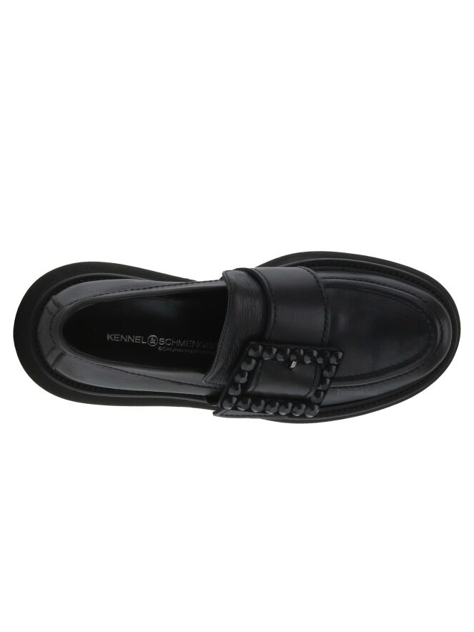 Een instapper van Kennel & schmenger in de kleur zwart. Op de voorvoet is een grote rechthoekige gesp met zwarte studs langs de randen. De stoere zool is gekarteld. De binnenkant is met leder gevoerd.