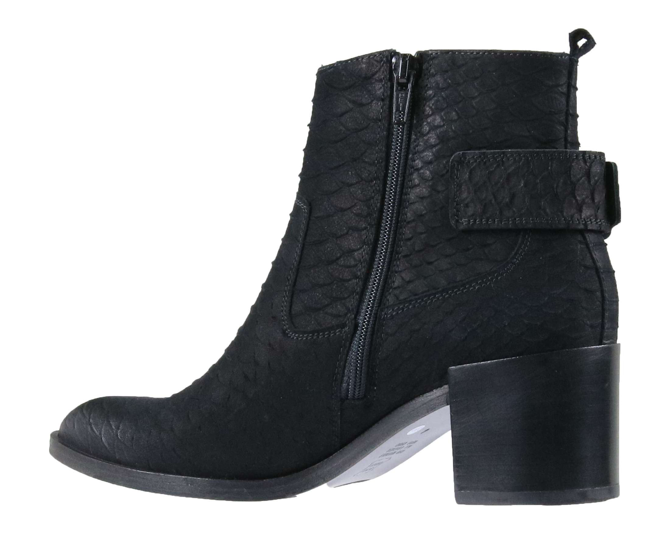 Een enkel laarsje in een western model met een reptiel structuur. De neus is gepunt en is licht geborsteld. Aan de buitenzijde zijn 2 ritsjes ingezet met een brede gesp die achter langs de hiel loopt. de binnen voering is van leder.