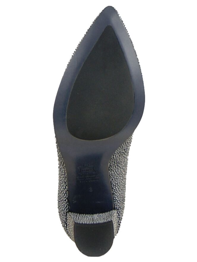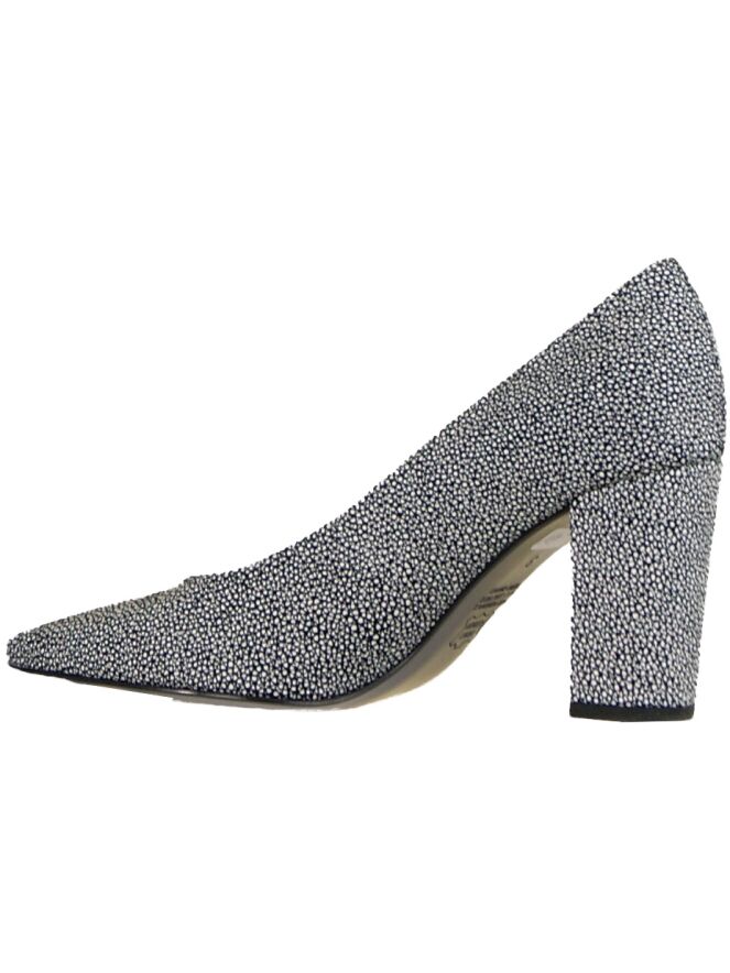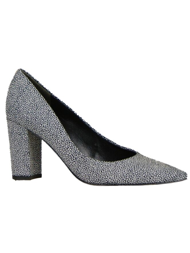 Een pump van K & S in een geribbelde reliëf print van zwart en wit. Het neusje loopt spits toe en de pump heeft een blokhak die bekleed is in hetzelfde materiaal als de pump zelf