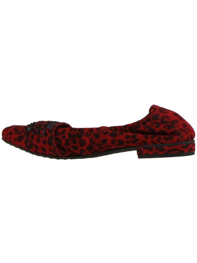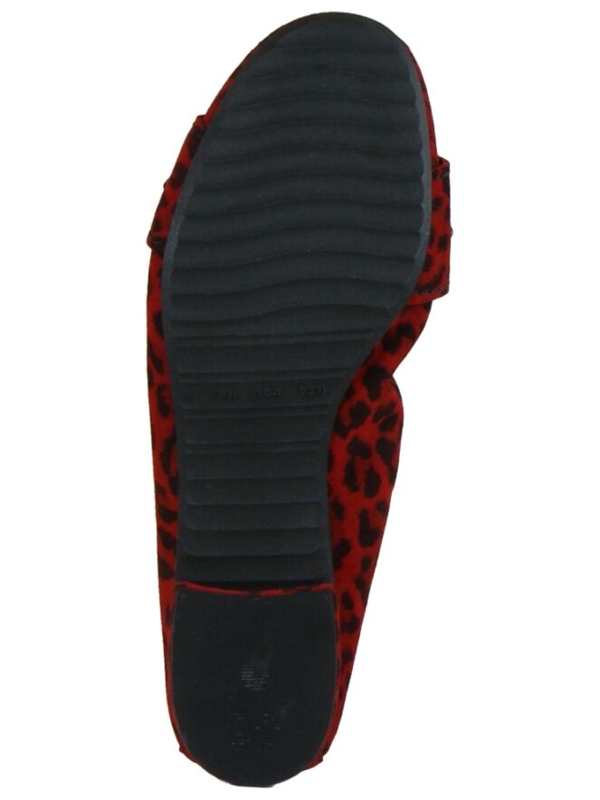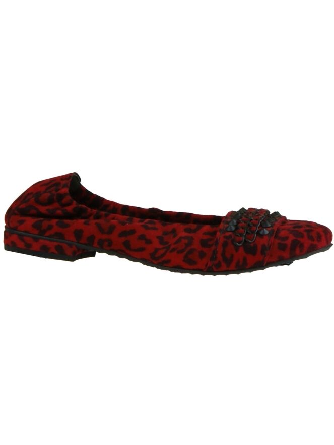 Een ballerina van K & S in een panterprint met de kleuren rood en zwart. OP de voorvoet met een rond neusje zijn mat zwarte studjes bevestigd en 2 kettingbandjes. Het hakje is bekleed in dezelfde print als de ballerina. De ballerina is niet van binnen gevoerd.