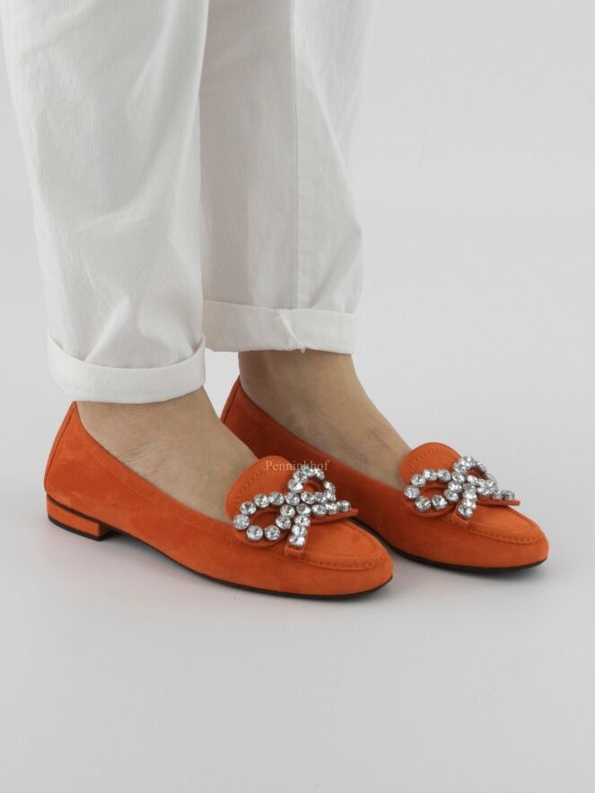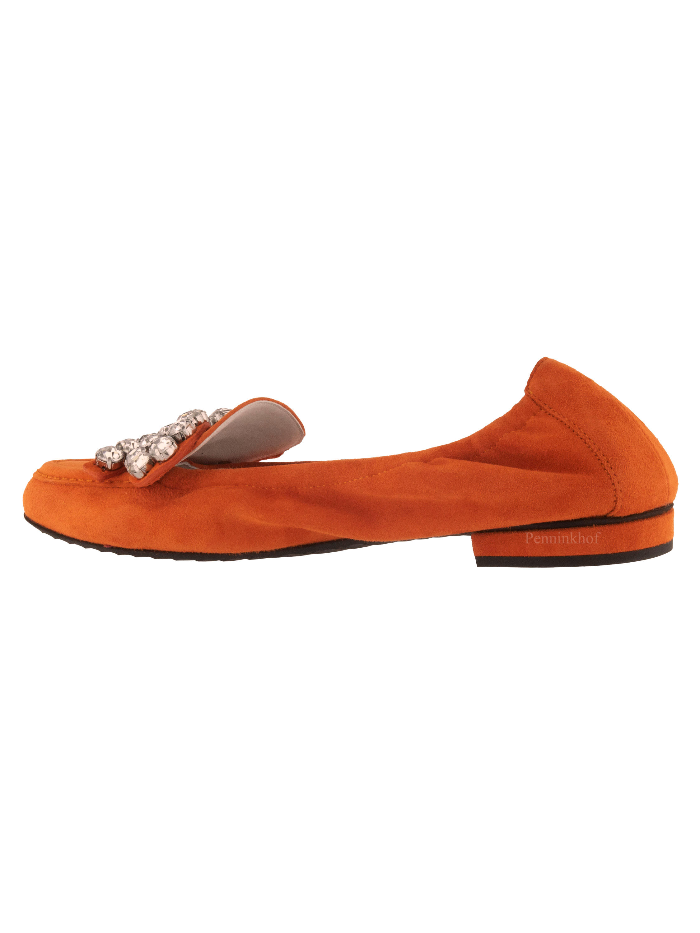 Een ballerina van Kennel & Schmenger in de kleur oranje. Over de voorvoet is een decoratieve strik met imitatie diamantjes.