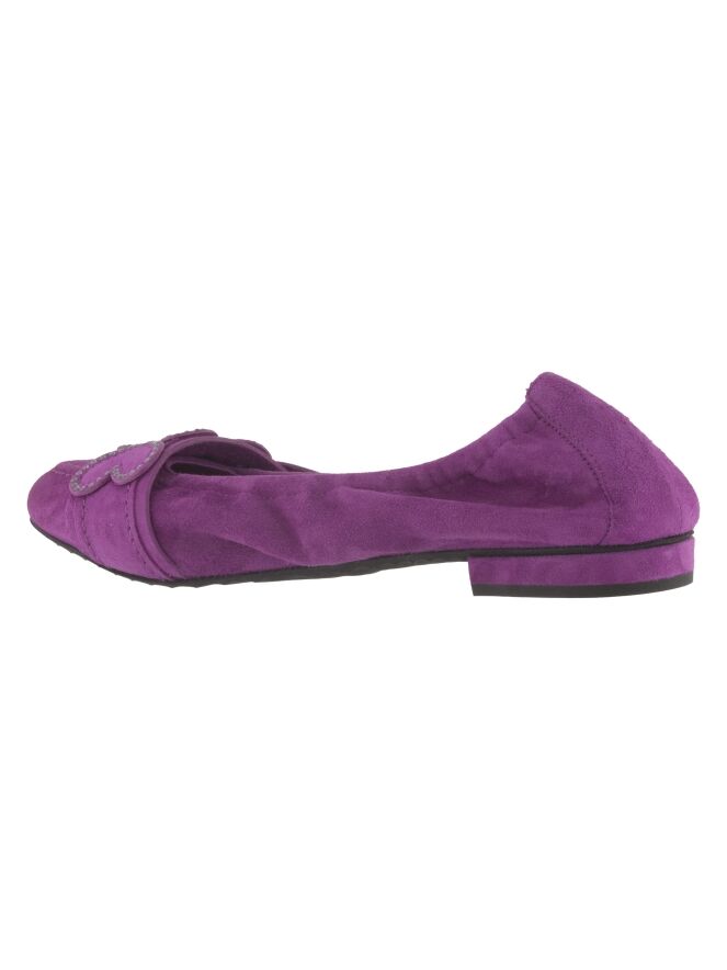 Een ballerina van Kennel & Schmenger in de kleur fuchsia. Over de voorvoet is een band met enkele decoratieve hartjes die zwartkleurige strassteentjes langs de randen hebben.