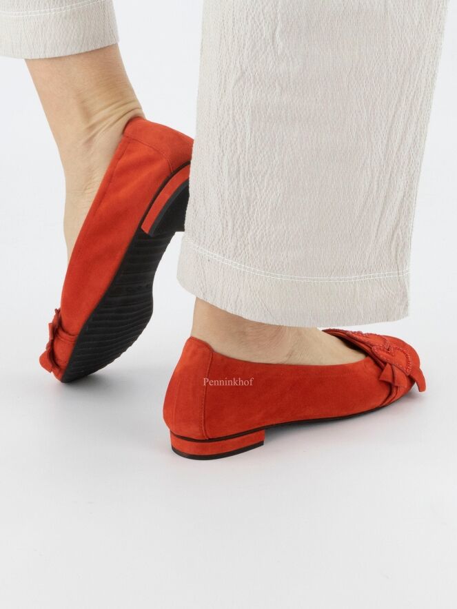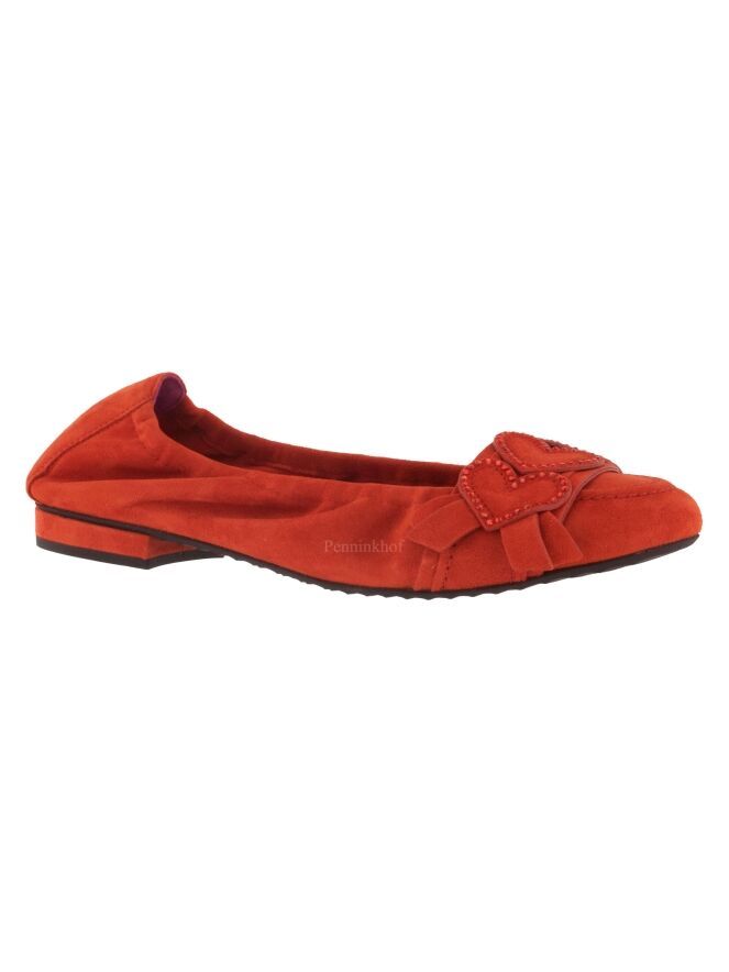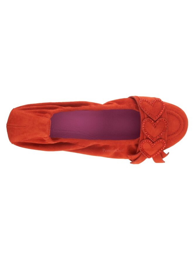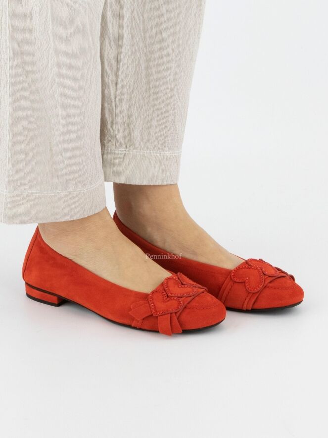 Een ballerina van Kennel & Schmenger in de kleur helder rood. Over de voorvoet is een band met enkele decoratieve hartjes die zwartkleurige strassteentjes langs de randen hebben.