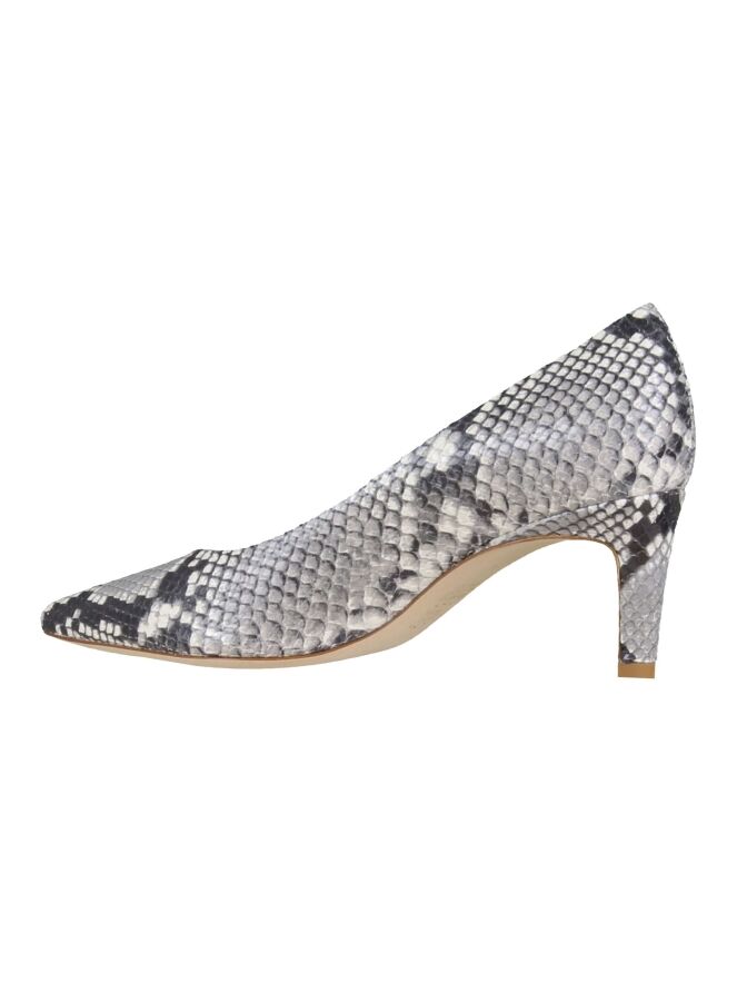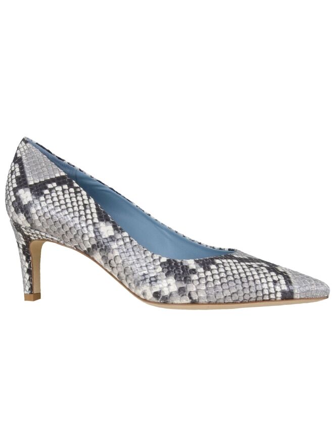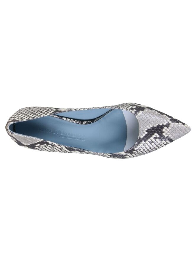 Een pump van Kennel und Schmenger in een pythonprint in meerdere tinten taupe. De pump heeft een spitse neus. De hak is in hetzelfde materiaal als de pump. De binnenkant is met leder gevoerd.