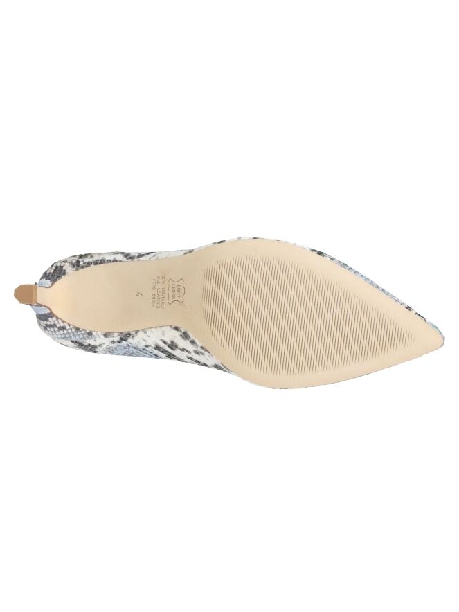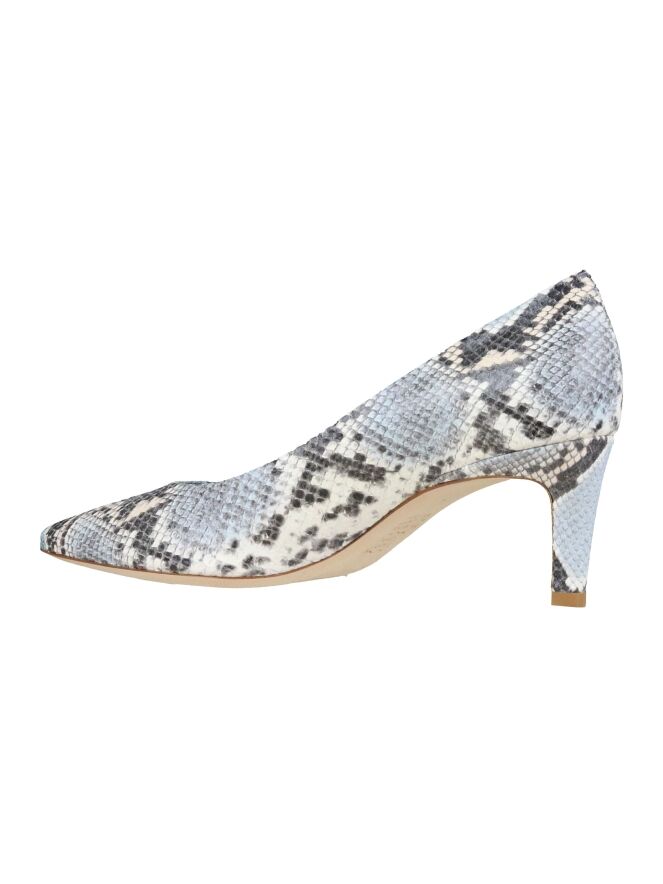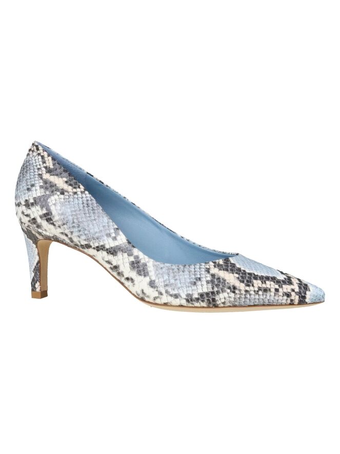 Een pump van Kennel und Schmenger in een pythonprint in meerdere tinten blauw, roomwit en grijs. De pump heeft een spitse neus. De hak is in hetzelfde materiaal als de pump. De binnenkant is met leder gevoerd.