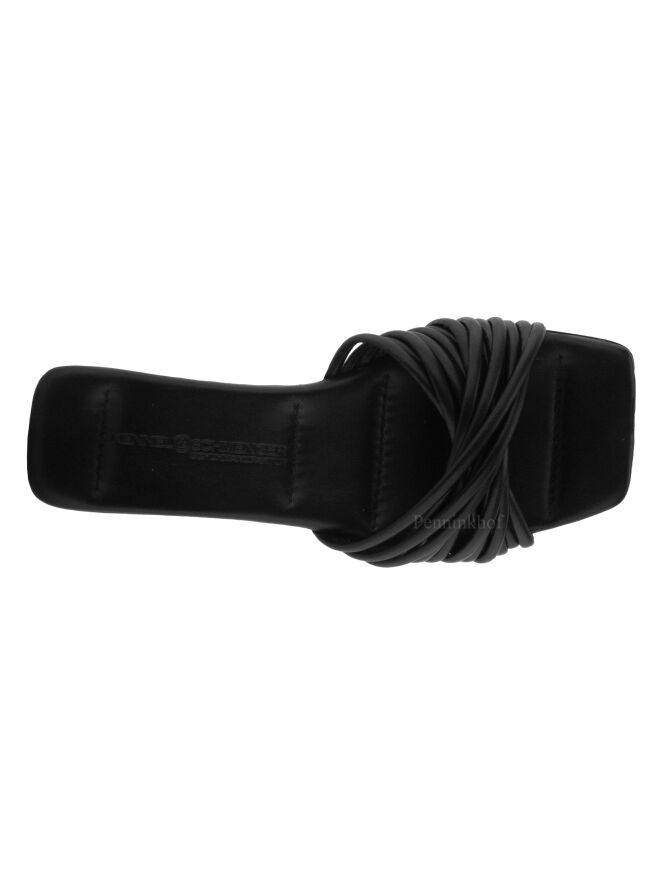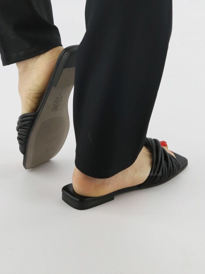 Een slippertje van Kennel en Schmenger in de kleur zwart. Ter hoogte van de voorvoet zijn meerdere lederen koorden als een waaier kruislings gespannen.