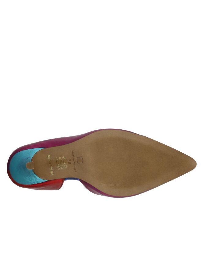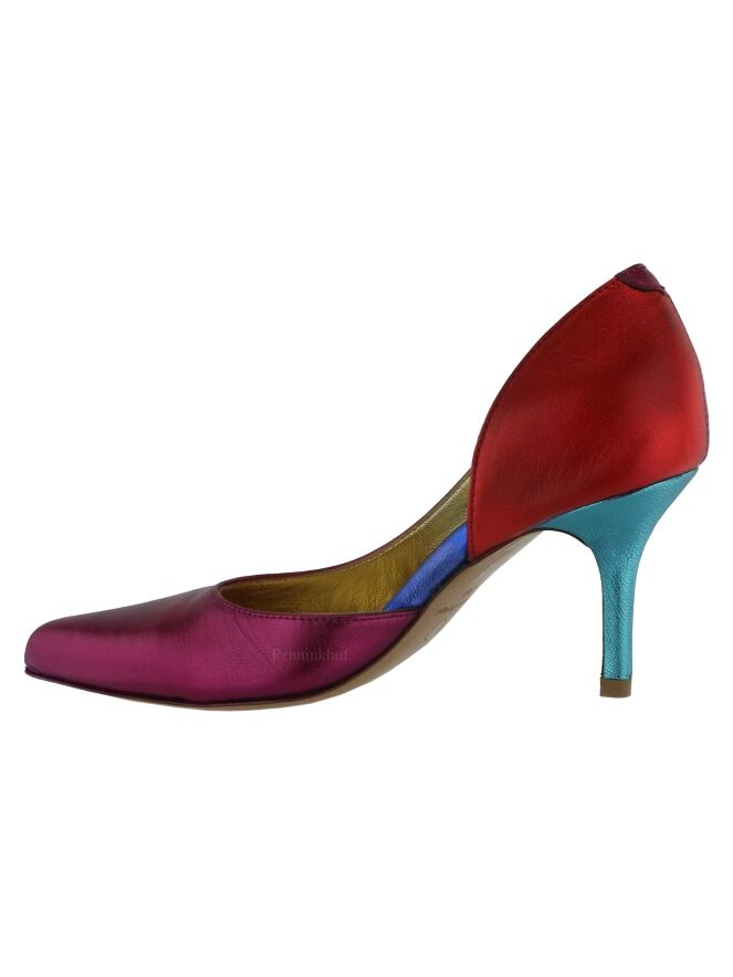Een pump van het merk Madore met de kleuren rood, kobaltblauw, paars en een turquoise hak. De binnenzijde van de pump is in het midden open. De pump heeft een spitse neus en is gevoerd aan de binnenkant.