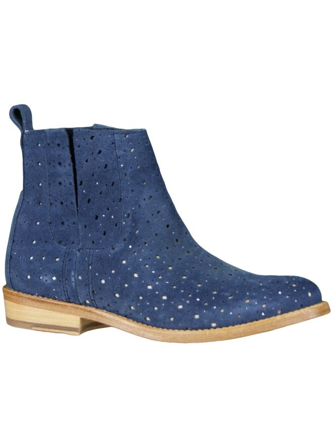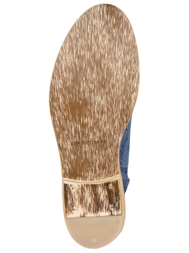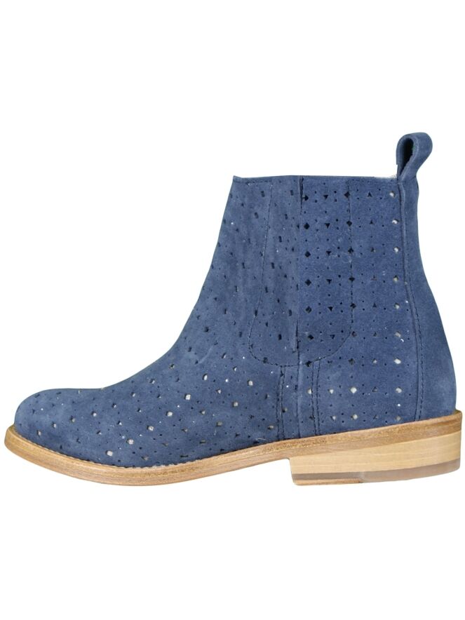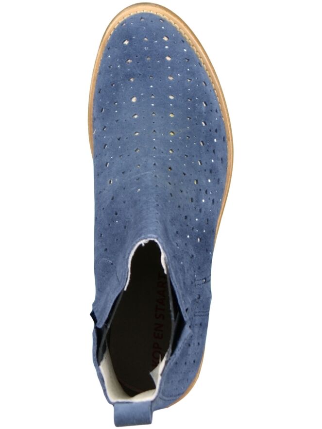 Een sportief enkel laarsje van het merk \"Kop en Staart\" in een jeans blauwe kleur. Het suède is geperforeerd en in het midden van de schacht is het suède gesneden met en elastieken band achter het suède verwerkt. Het laarsje heeft een lichtbruine zool.