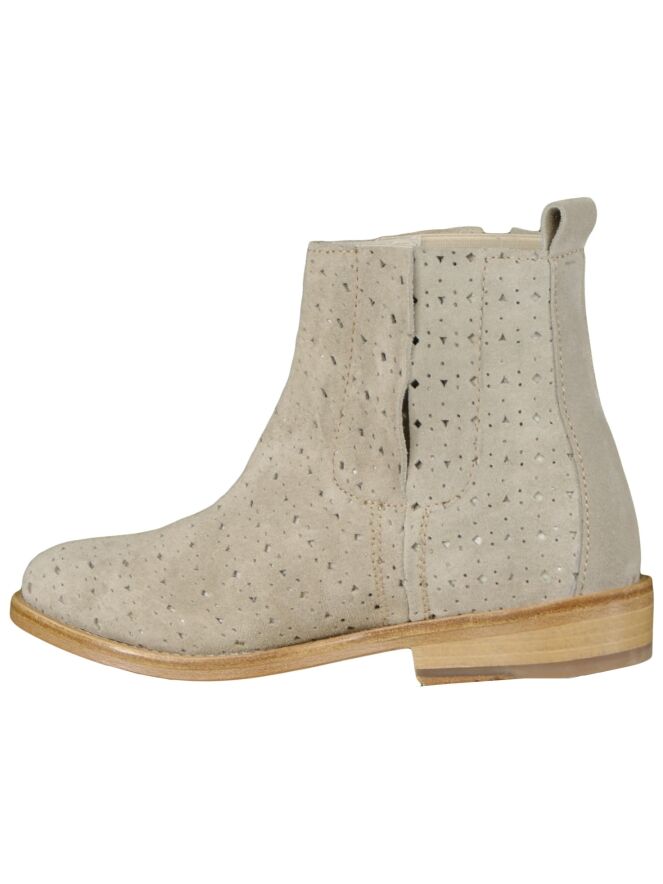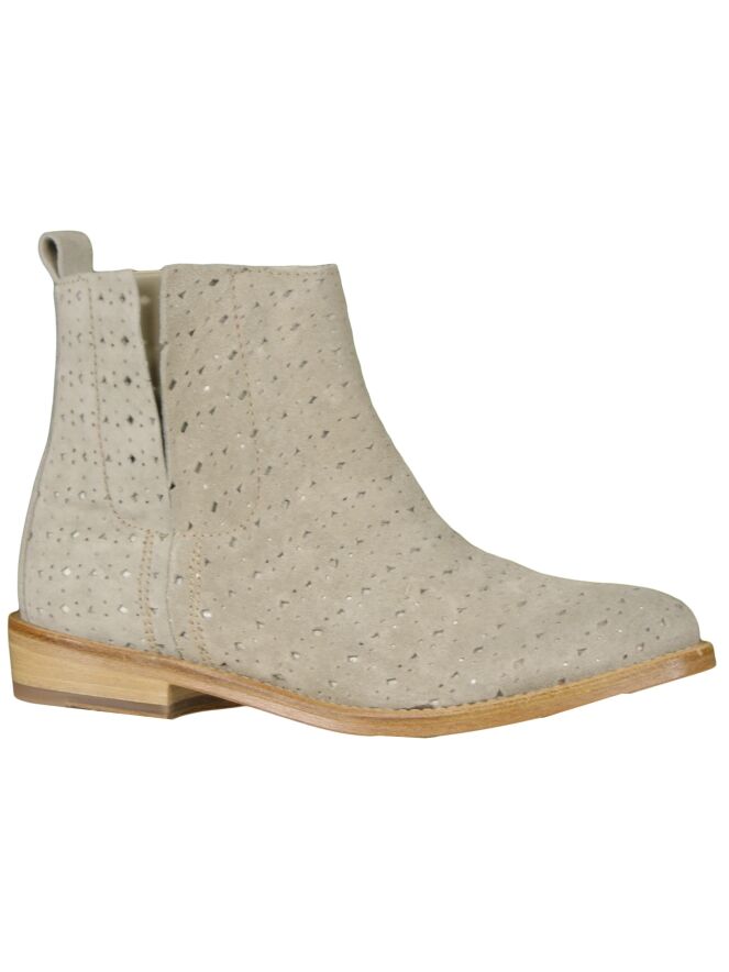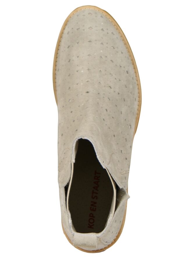 Een sportief enkel laarsje van het merk  \"Kop en Staart\" in een beige kleur. Het suède is geperforeerd en in het midden van de schacht is het suède gesneden met en elastieken band achter het suède verwerkt. Het laarsje heeft een lichtbruine zool.