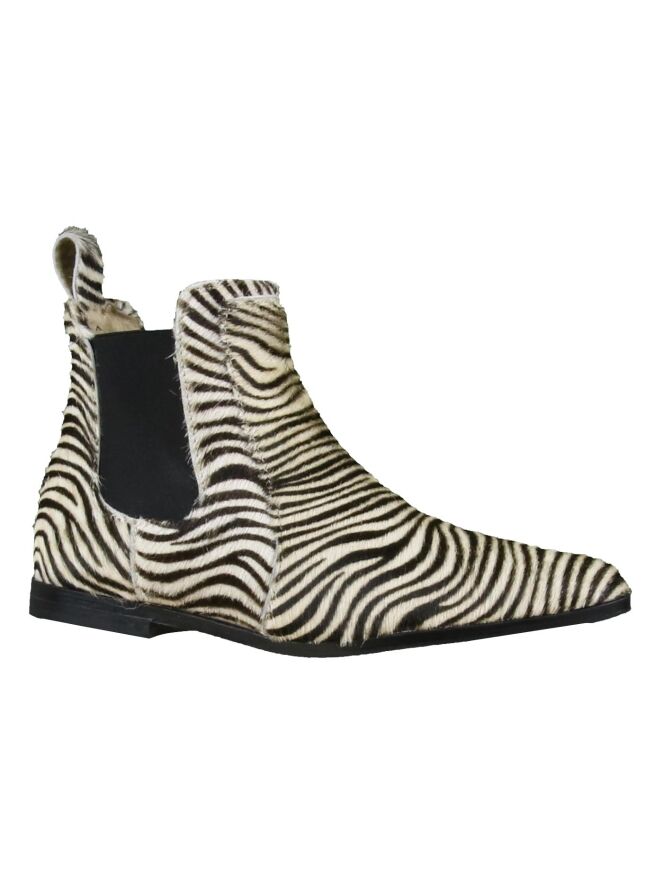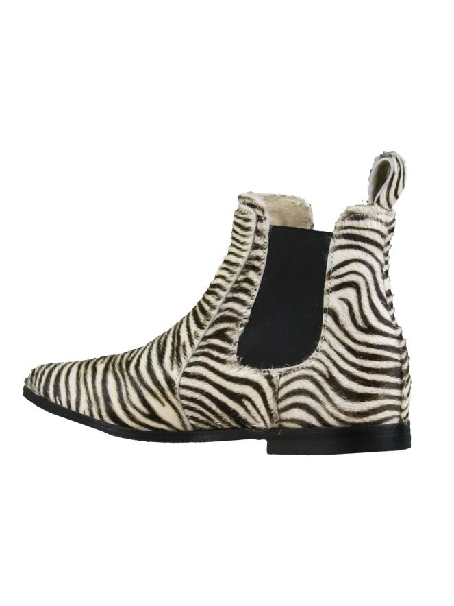 Een enkellaarsje van Kop en Staart in een zebraprint met de kleuren roomwit en zwart. Aan beide zijkanten is elastiek ingezet. Het laarsje heeft een spitse neus en is aan de binnenkant met leder gevoerd.